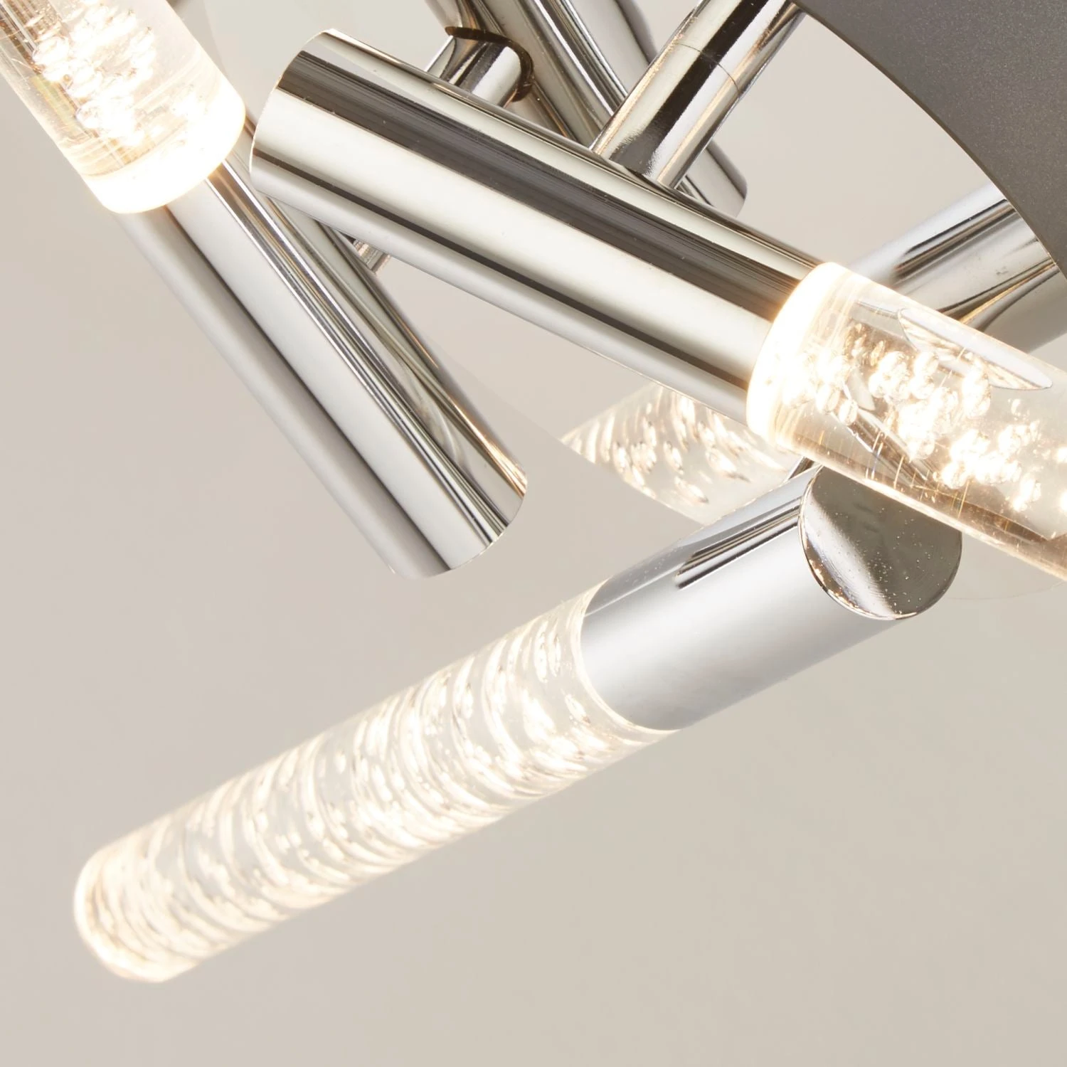 The elegant design of this 3-arm bubble glass pendant boasts three sleek, clear, thin rectangular shades that elevate any living room or bedroom. Its stylish shades provide ample illumination while contributing to a modern ambiance.