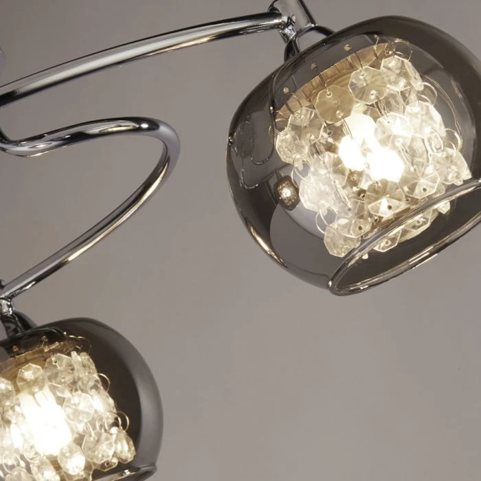 Add the modern design of the 3 light ceiling fitting to your home. The chrome base features a swirl design that leads to 3 smoked glass shades. Add to any room of the home as a statement piece.