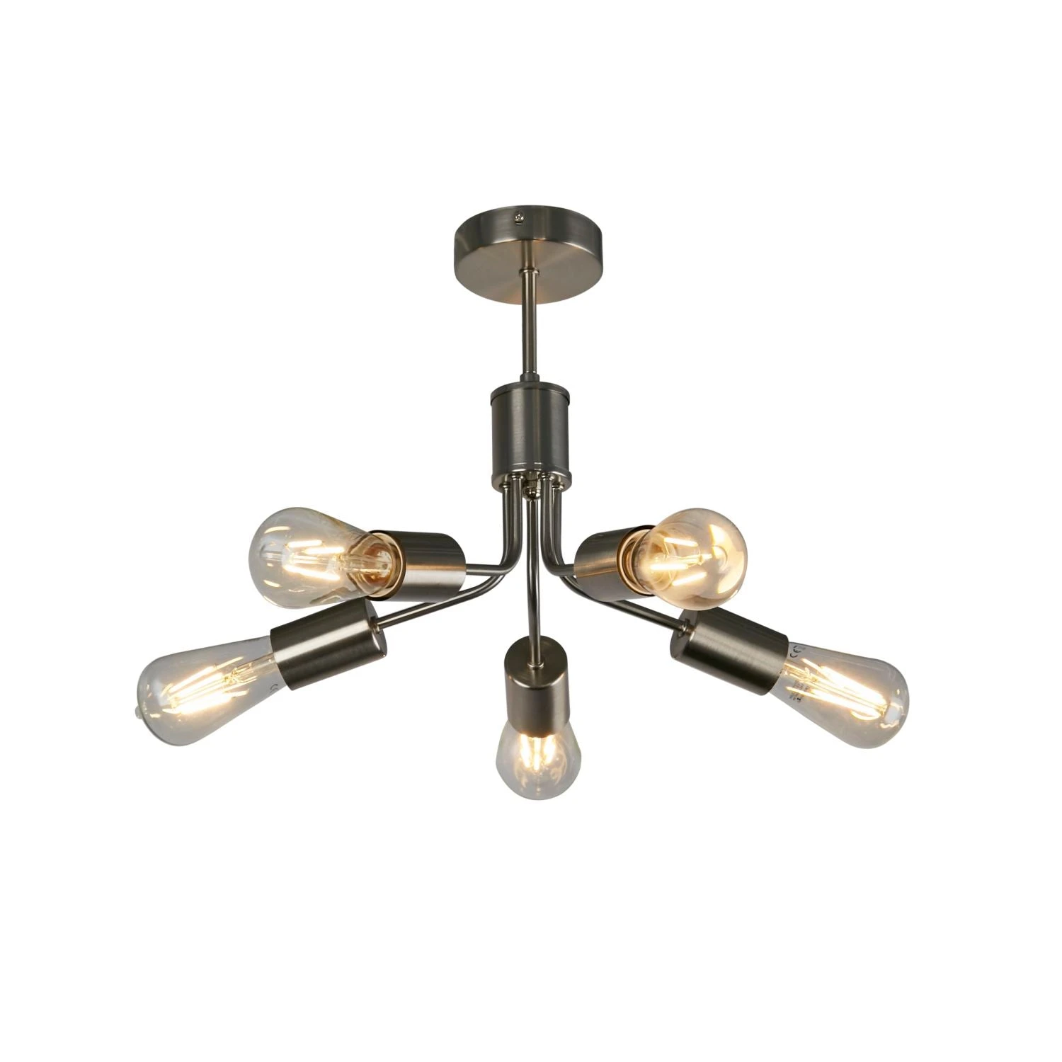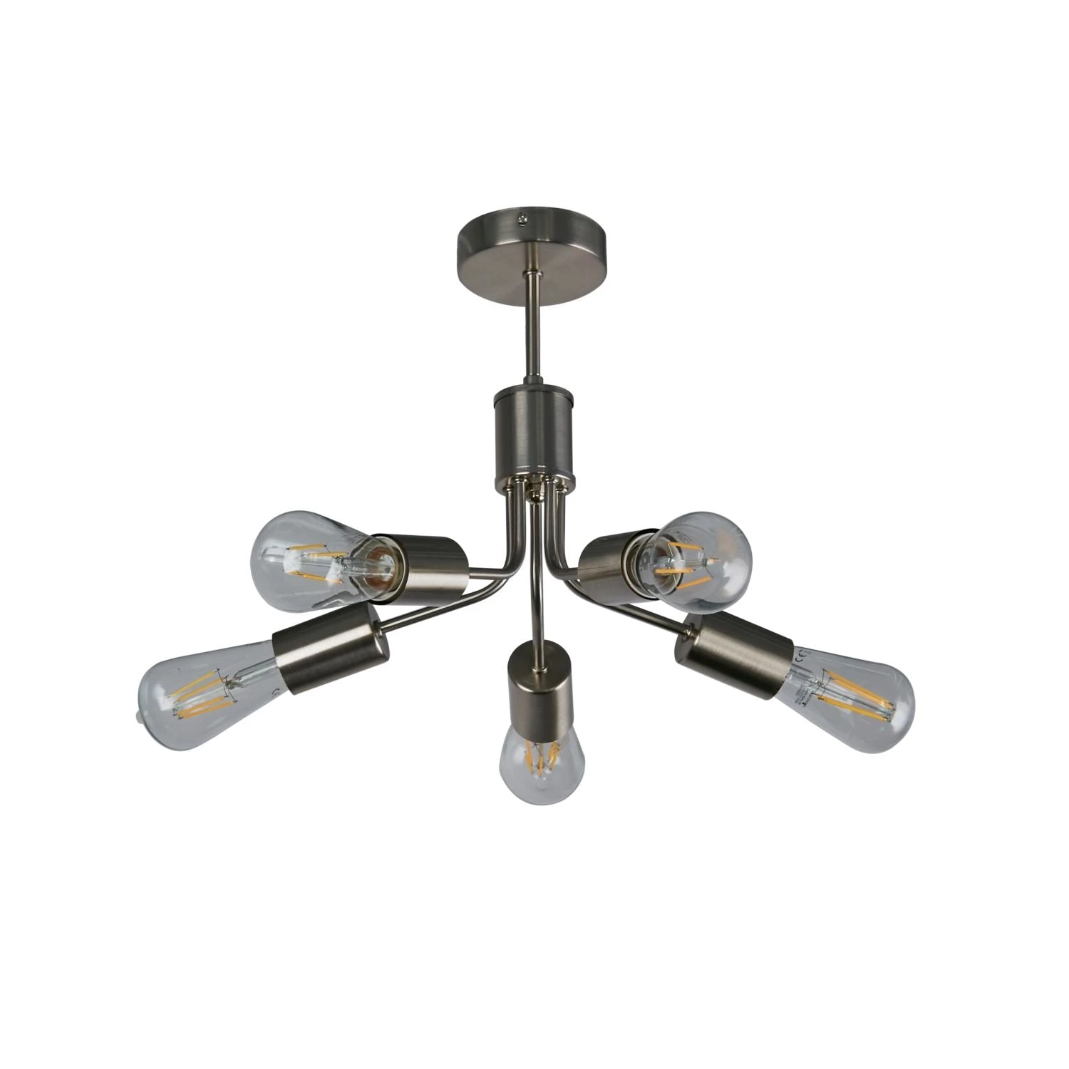 Infuse an industrial ambiance into kitchens or living rooms using this 5-light chrome ceiling light. Equipped with satin silver lamp holders, each bulb extends to radiate light, ensuring comprehensive illumination and a captivating, modern feel in the room.
