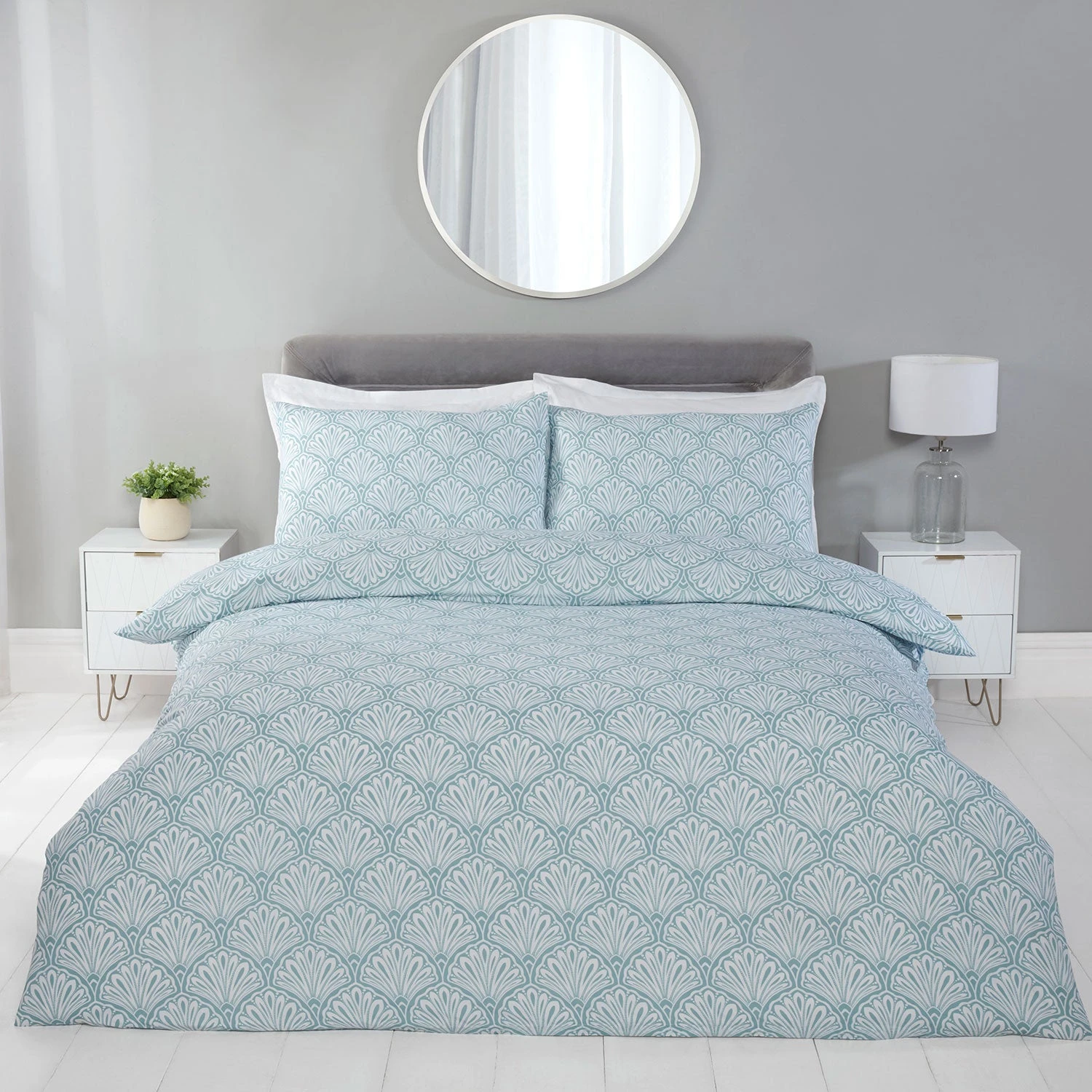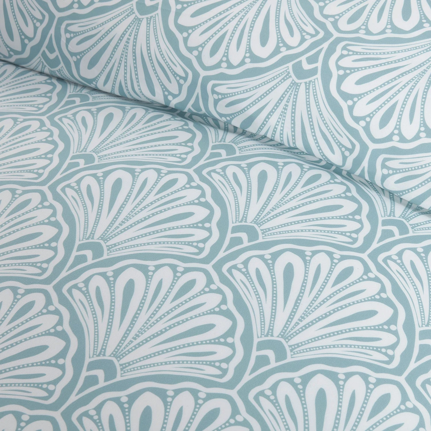 This unique deco fan pattern on a duck egg background is designed to create a statement in any bedroom and will complement your home décor.