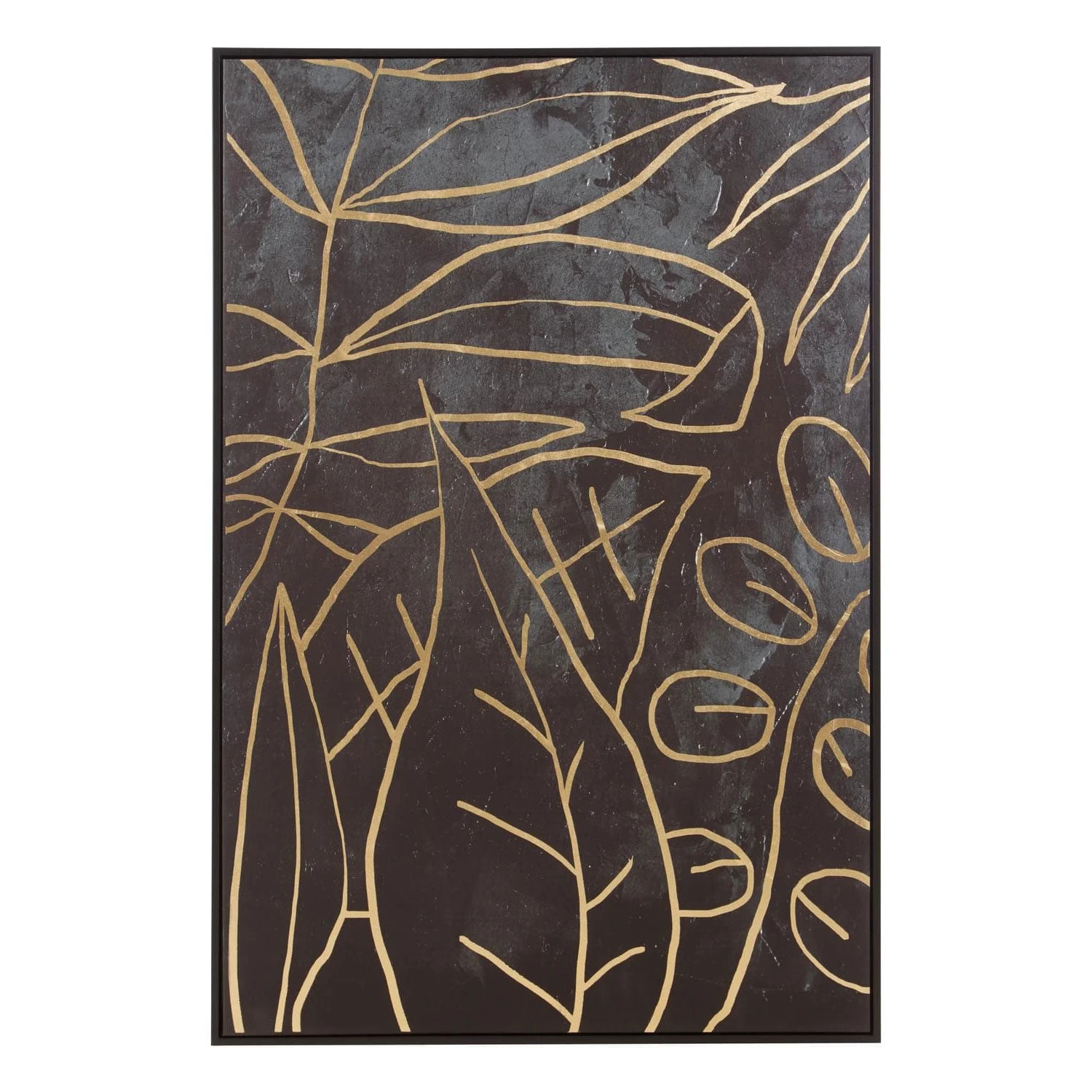 Introducing the Astratto Canvas Black and Gold Wall Art, where sophistication meets modern artistry. This exquisite piece features a deep black canvas meticulously stretched across a premium solid wood frame, presenting a bold statement of elegance and durability. Captivating gold foil is expertly applied to create an intricate array of botanic-inspired motifs, each one sparkling under the light and inviting a closer look.