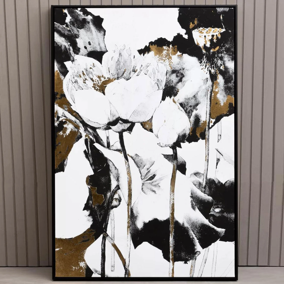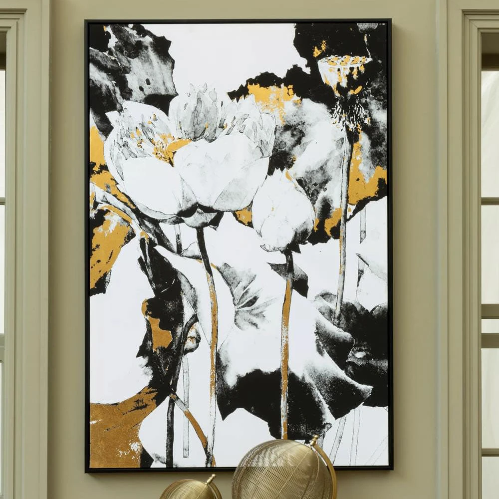 The Astratto wall art is framed in natural wood, coloured black and with a minimal design that does not distract the eye. White canvas is stretched into the frame, and a contemporary floral scene is depicted using foil. The foil is predominately black and white, with gold accents that introduce some metallic warmth to the whole.