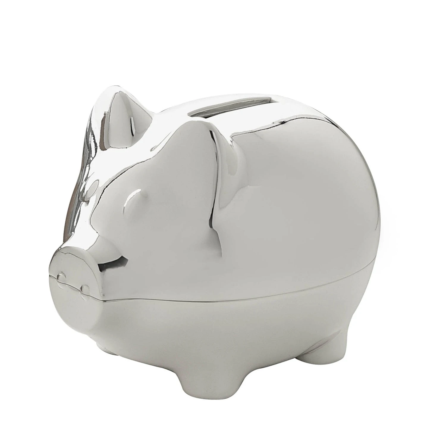 This wonderful keepsake provides glistening decoration for the nursery of new family arrivals which will be cherished eternally. The real silver plated money box offers great attention to detail which perfectly captures the charm of traditional piggy banks. It features a combination of textured and smooth finishes, complete with large money slot for saving coins and an easy-to-remove rubber bung on the base.