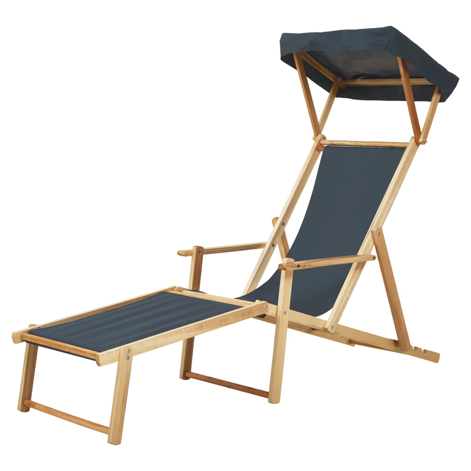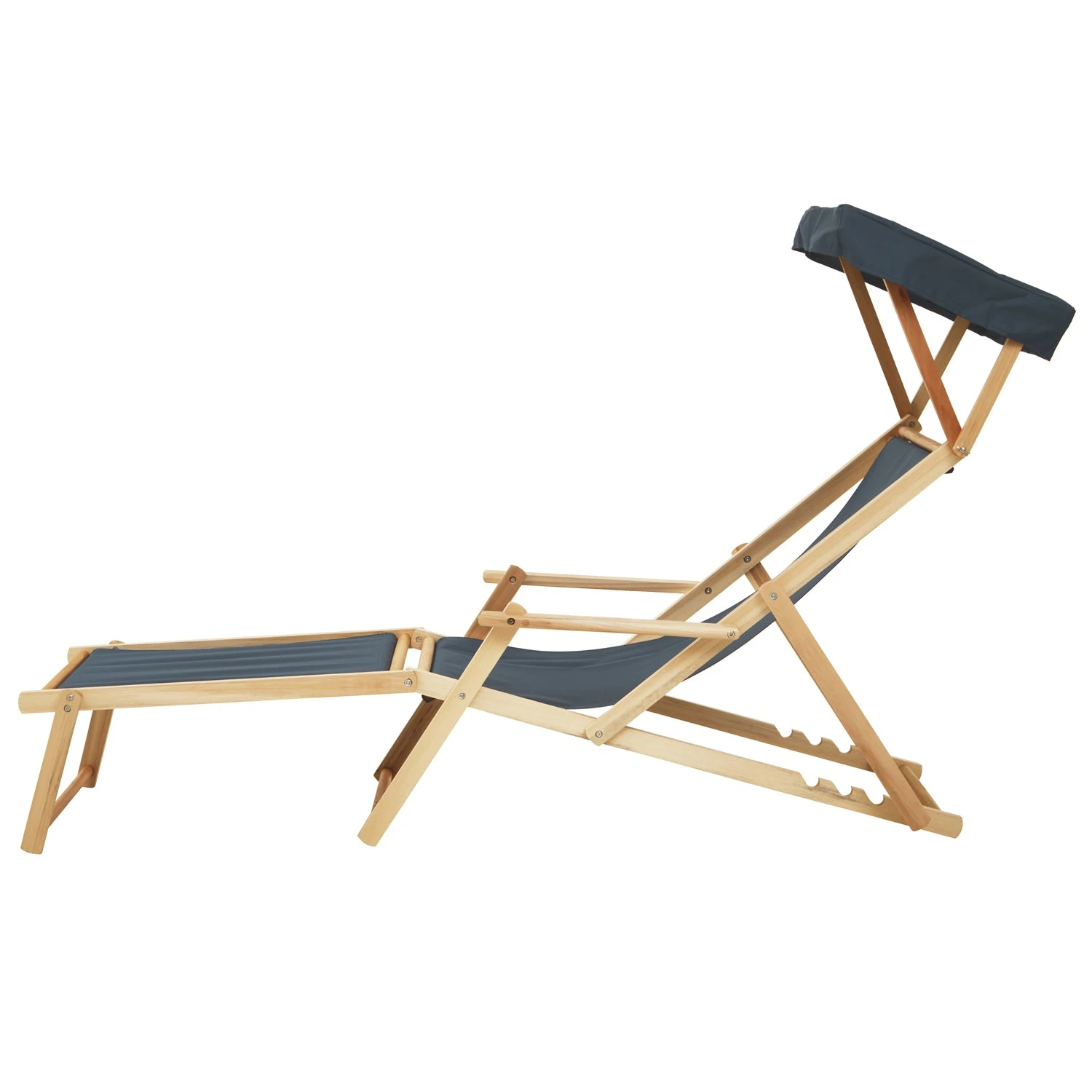 This lounger is suitable for outdoor use, thanks to the sturdy grey fabric. This lounger is weather-resistant and easy to clean. The backrest can be adjusted for a comfortable position. Made from solid wood in natural finish, it combines style and functionality.