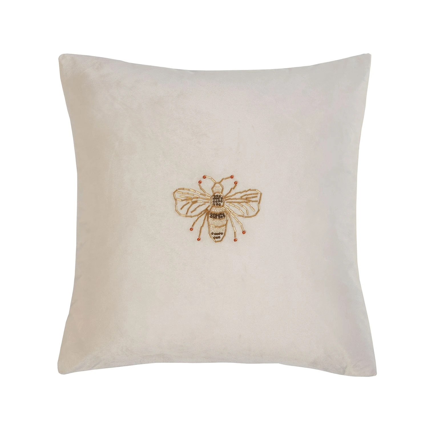 This luxurious and glamorous cushion features an intricate and detailed embroidered beaded bee design on a soft natural cream velvet background.