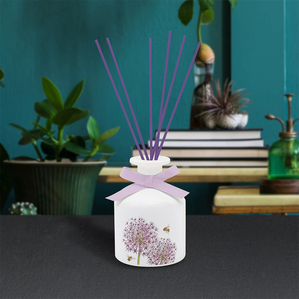 Indulge in the refreshing aroma of Alliums with our captivating diffuser. Perfectly presented in a pristine white jar adorned with beautiful hand-drawn Alliums and bees, complete with an elegant purple bow, this Alliums diffuser is the ideal gift or personal treat.