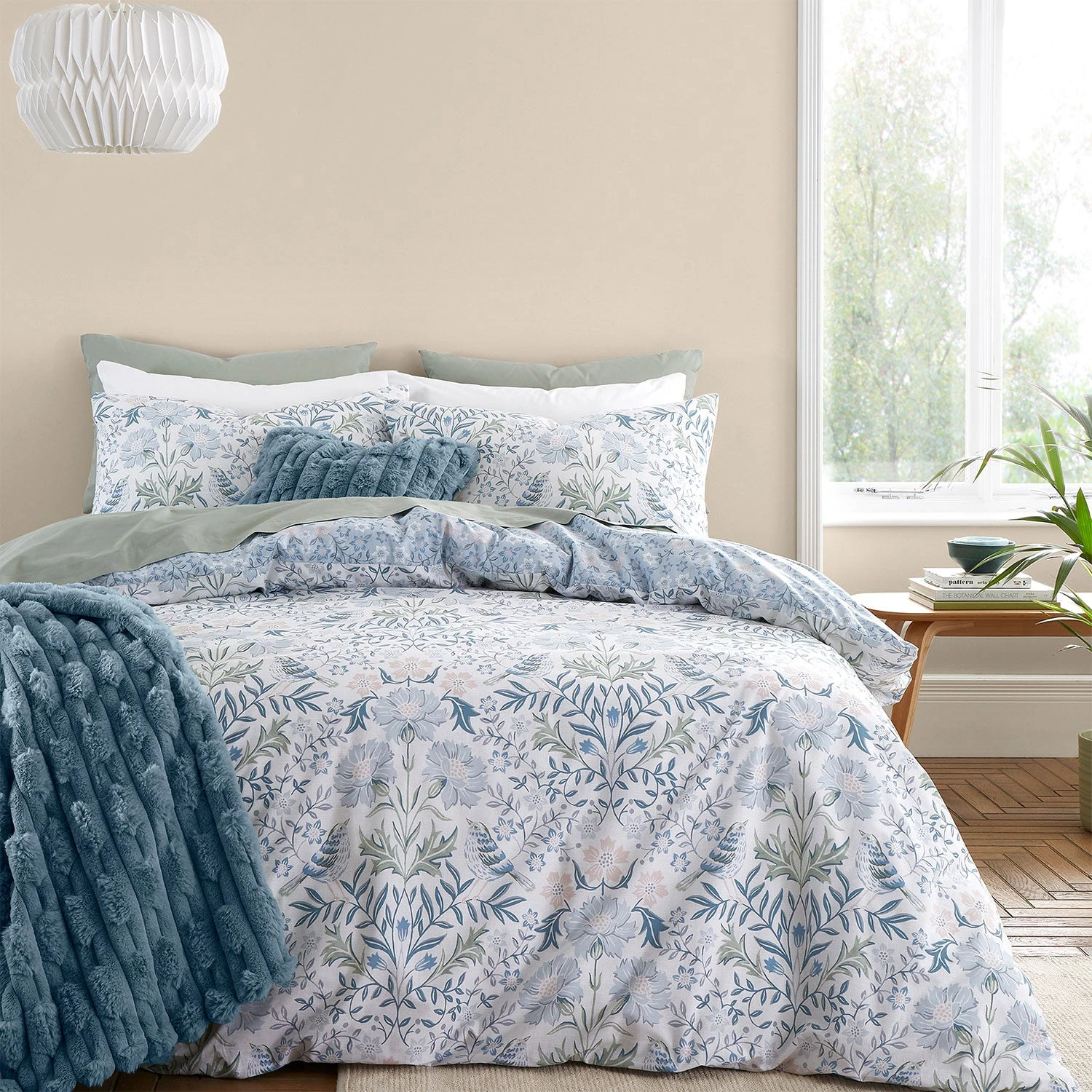 Indulge your room with an enchanting tapestry of nature’s beauty on a pure cotton canvas. Delicate birds, blooming flowers, and intertwining leaves harmoniously dance across the front while a soft floral reverse complements the overall look.