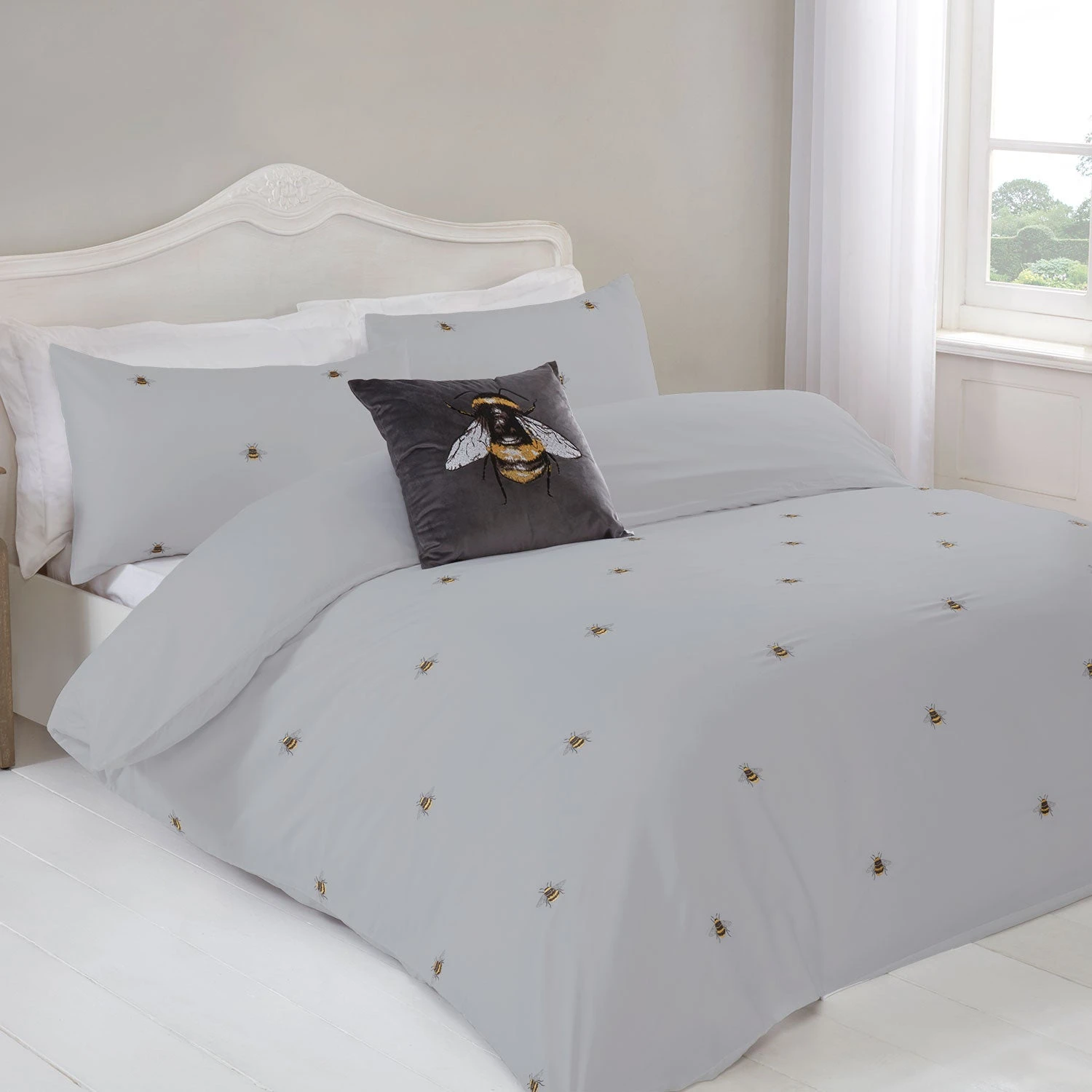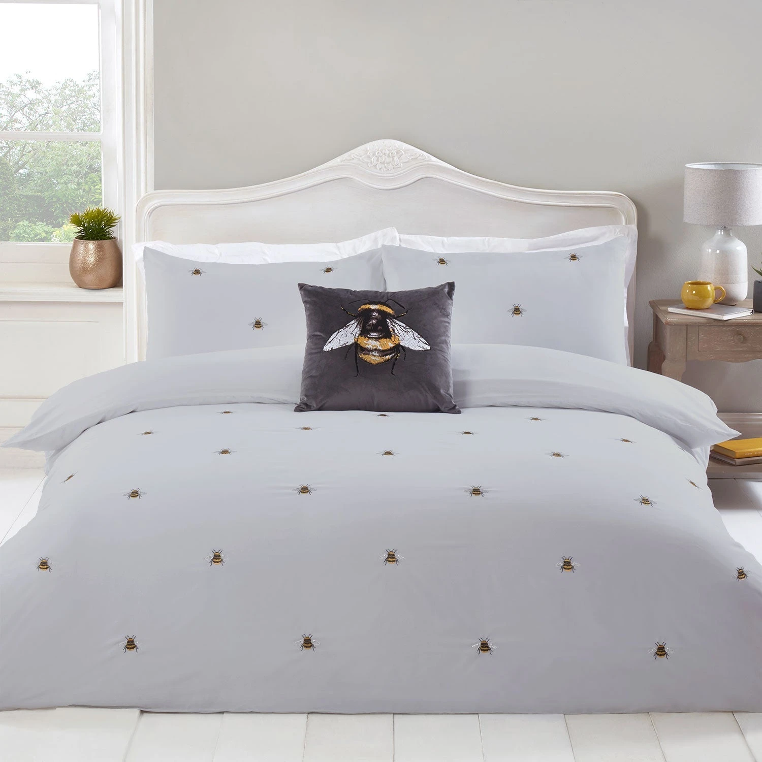 Add a touch of sophistication to your bedroom with this chic design featuring beautifully embroidered mini bumblebees. Presented on a chic grey ground, this duvet set sits elegantly on the bed and offers a beautifully soft and durable finish.