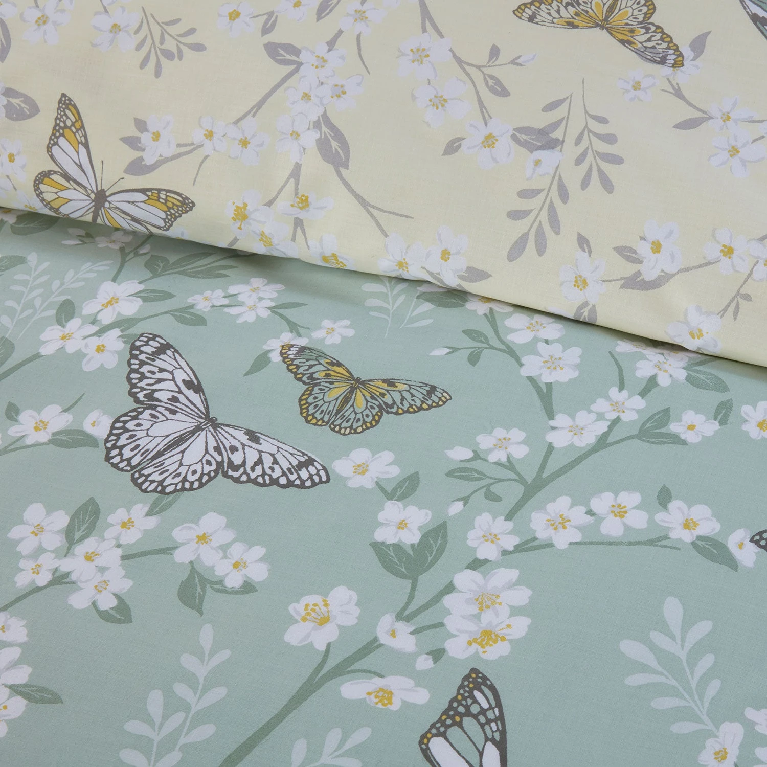 Add a charming and whimsical bedding set that features a beautiful butterfly design on a soft lemon background. The duvet set features a playful array of colourful butterflies and flowers in joyful shades of sage and lemon, with a complimentary reverse for an alternative look.