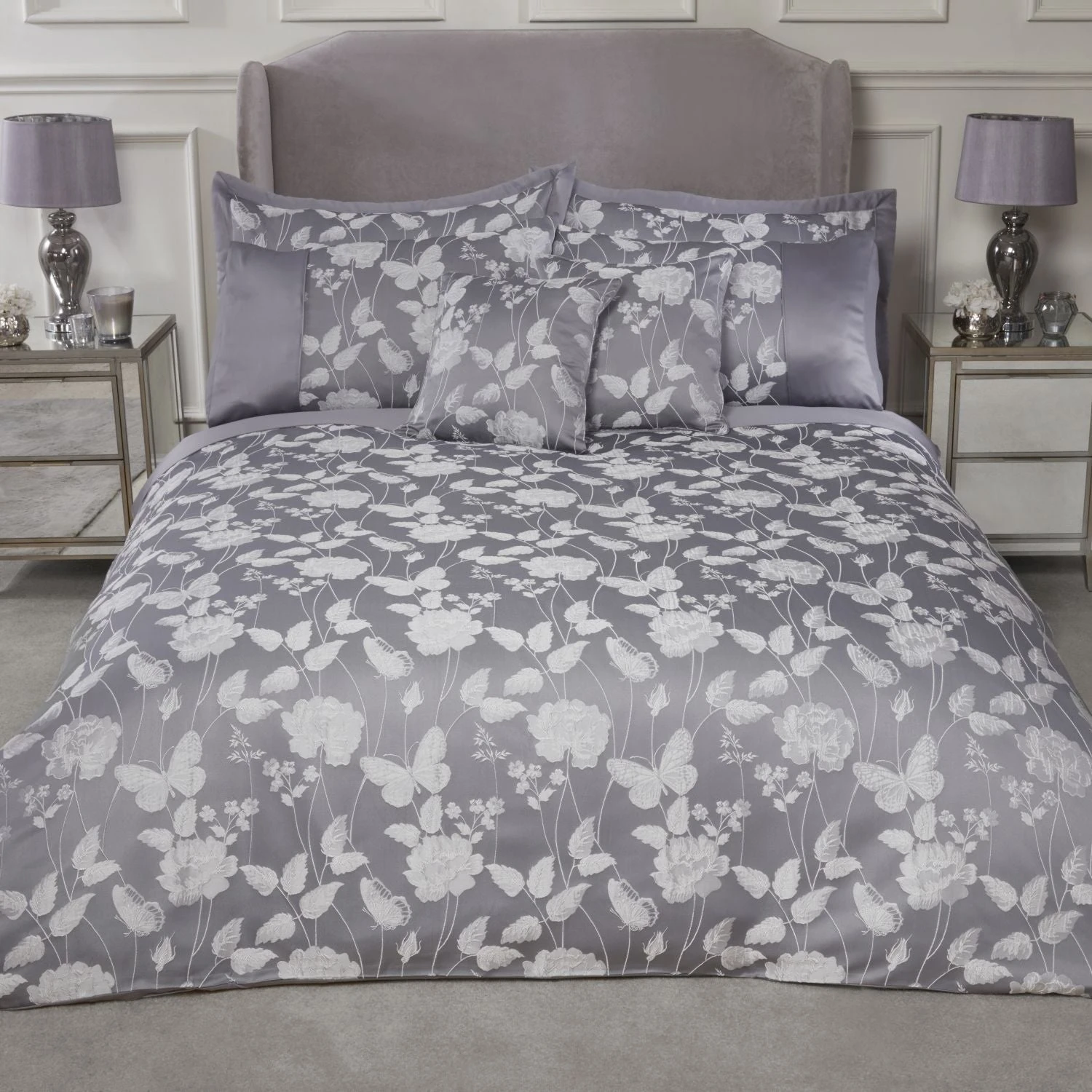 Bring a touch of beauty to your bedroom with the Silver Butterfly Meadow Embellished Jacquard Duvet Set.