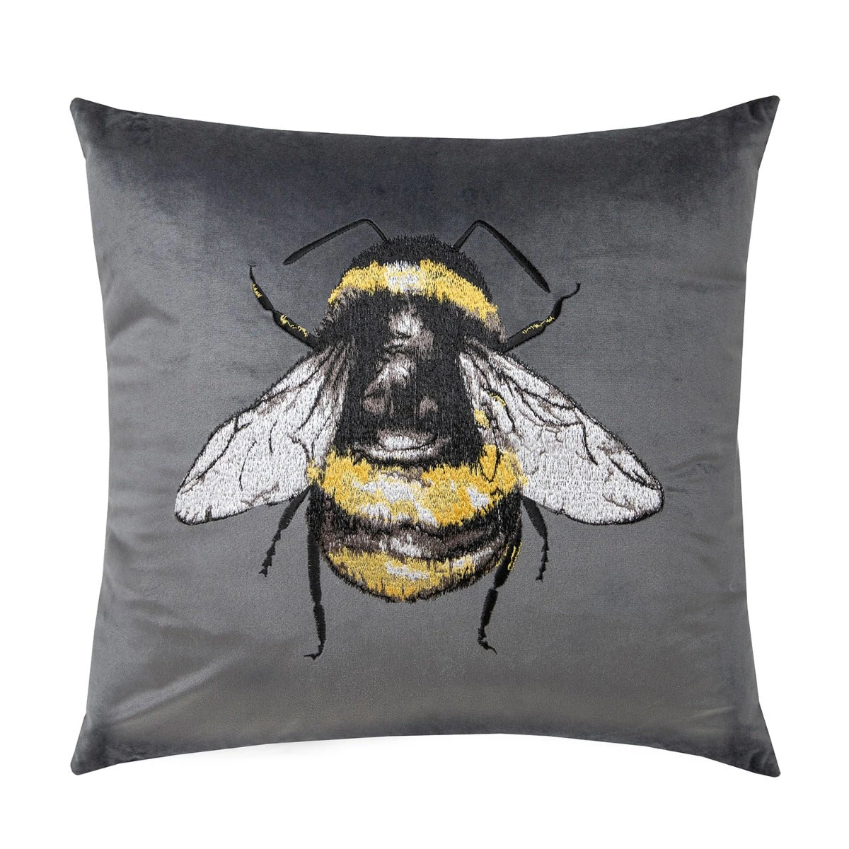 Charcoal Grey Velvet Bumblebee Embroidered Cushion (43cm X 43cm)