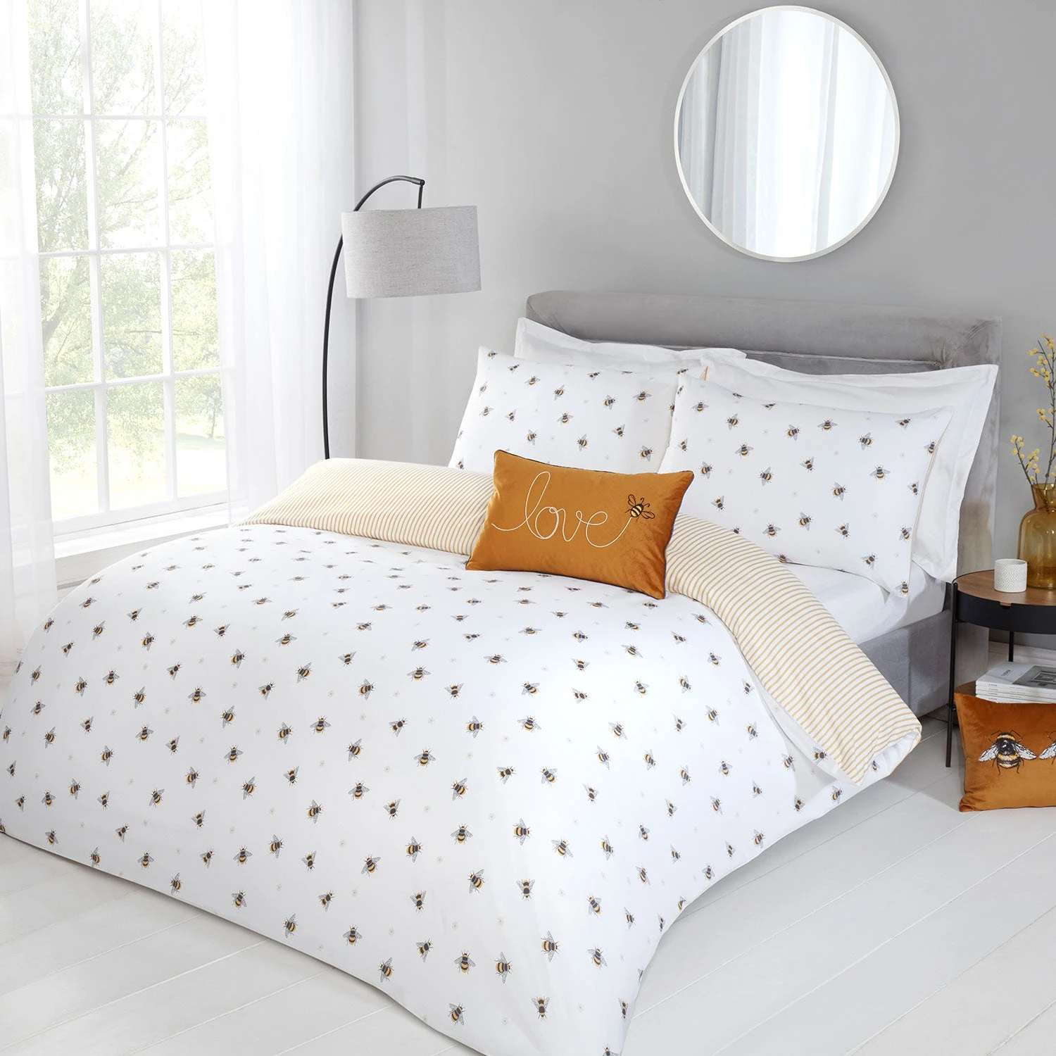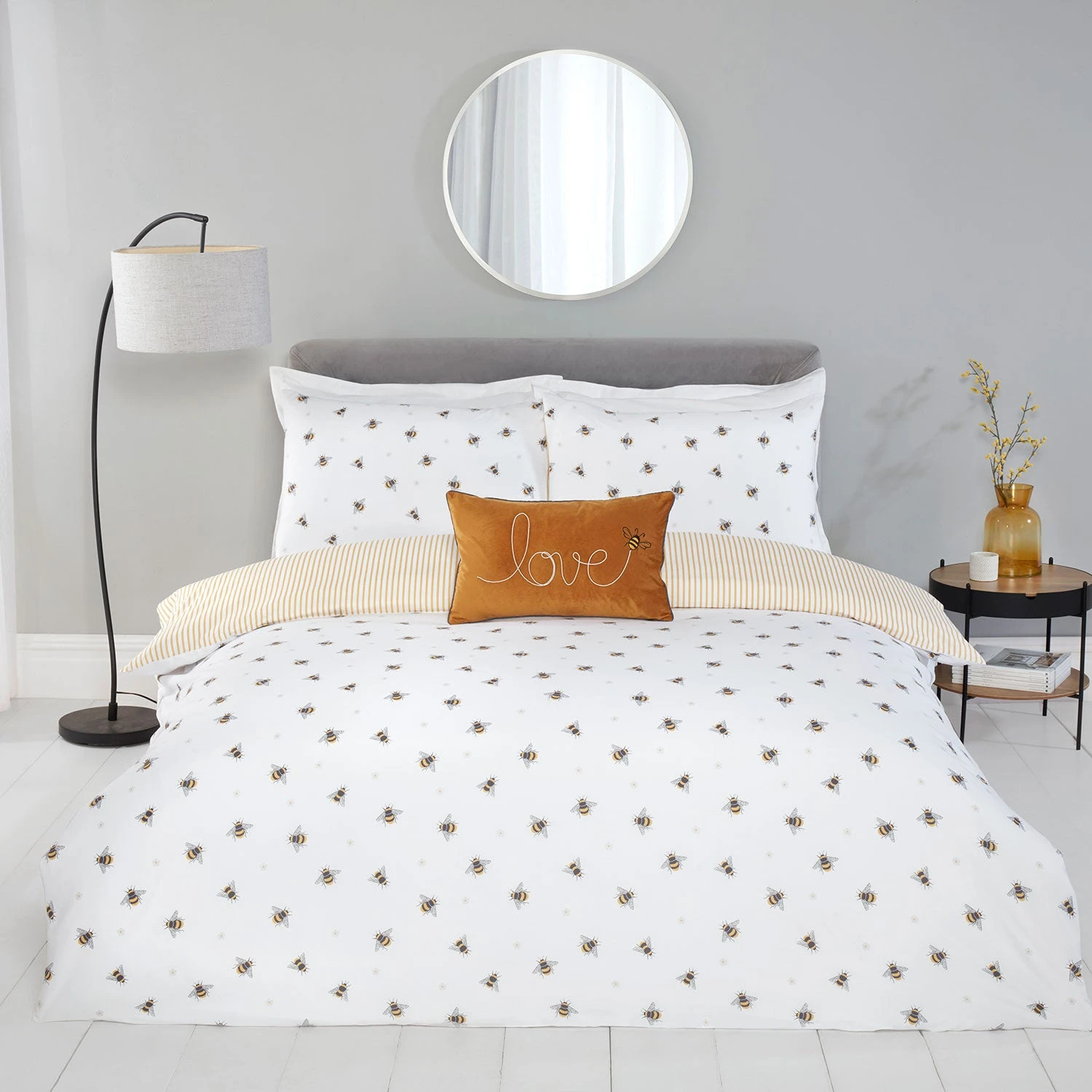 This bedding set is designed with ditsy floral, and bee print on a crisp white background with a subtle ochre stripe reverse.