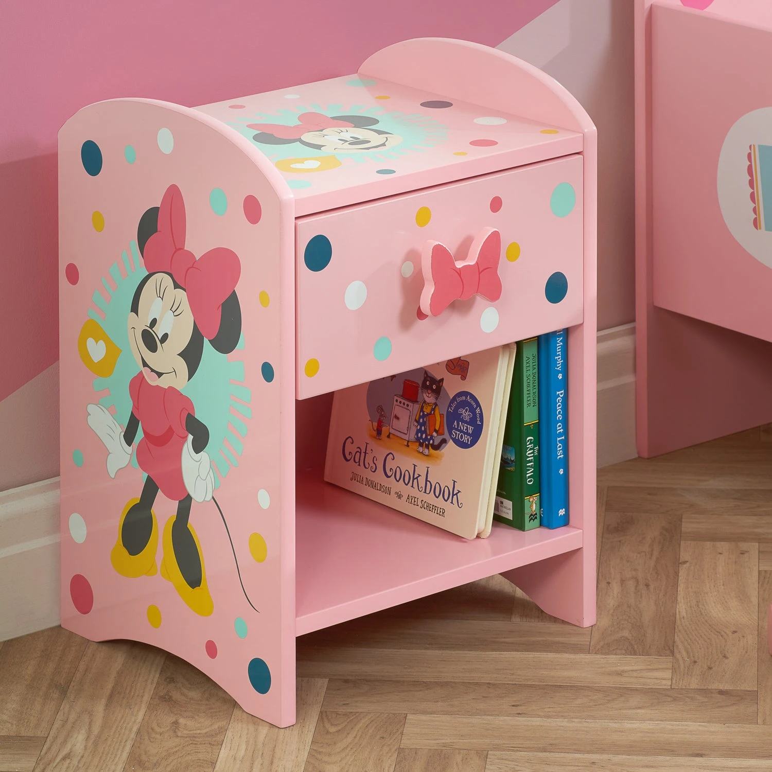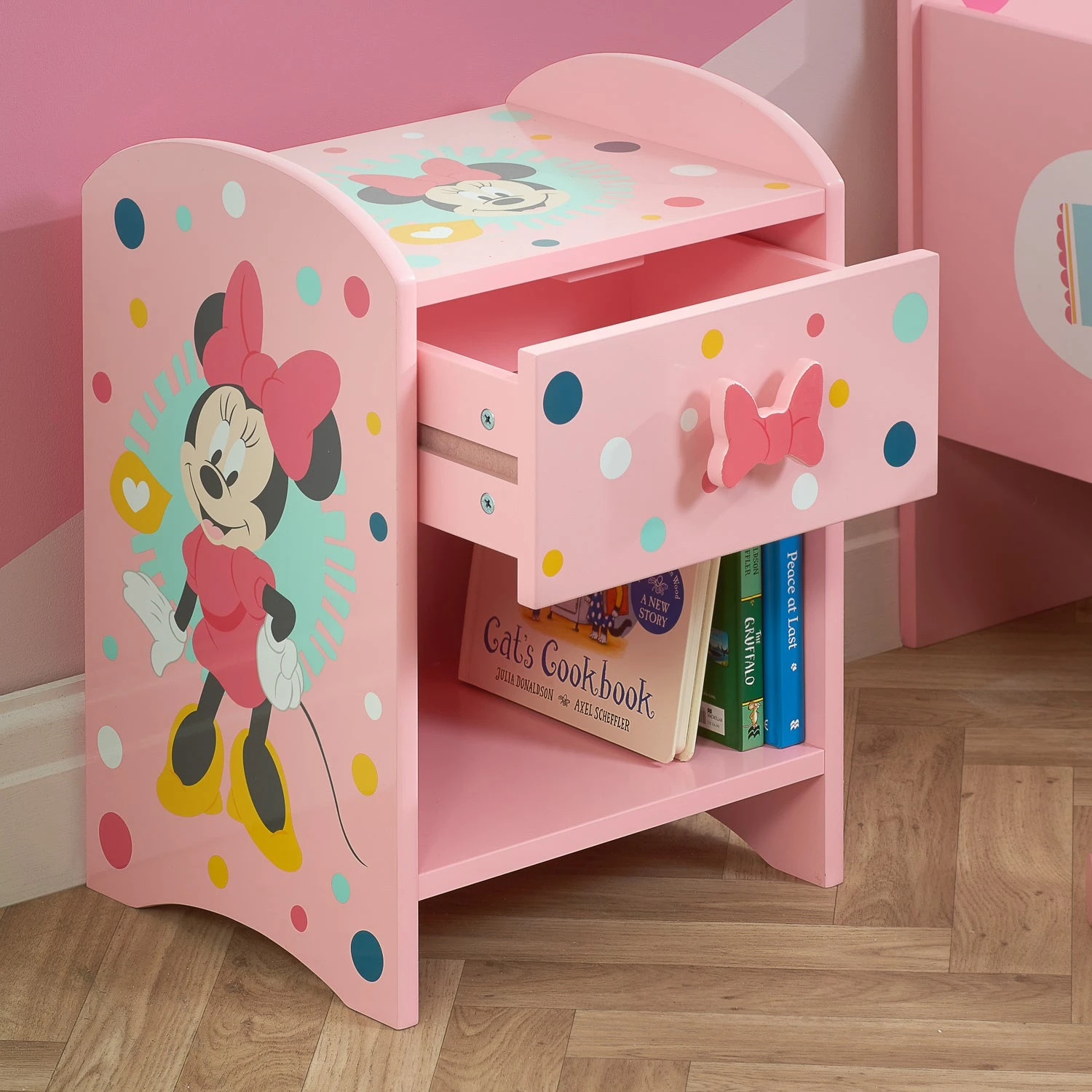 Yoo-hoo! This is a must have bedside unit for all Disney Minnie Mouse fans. The Minnie Mouse bedside unit presents a quick and convenient storage solution for toys, books, night lights and much more.