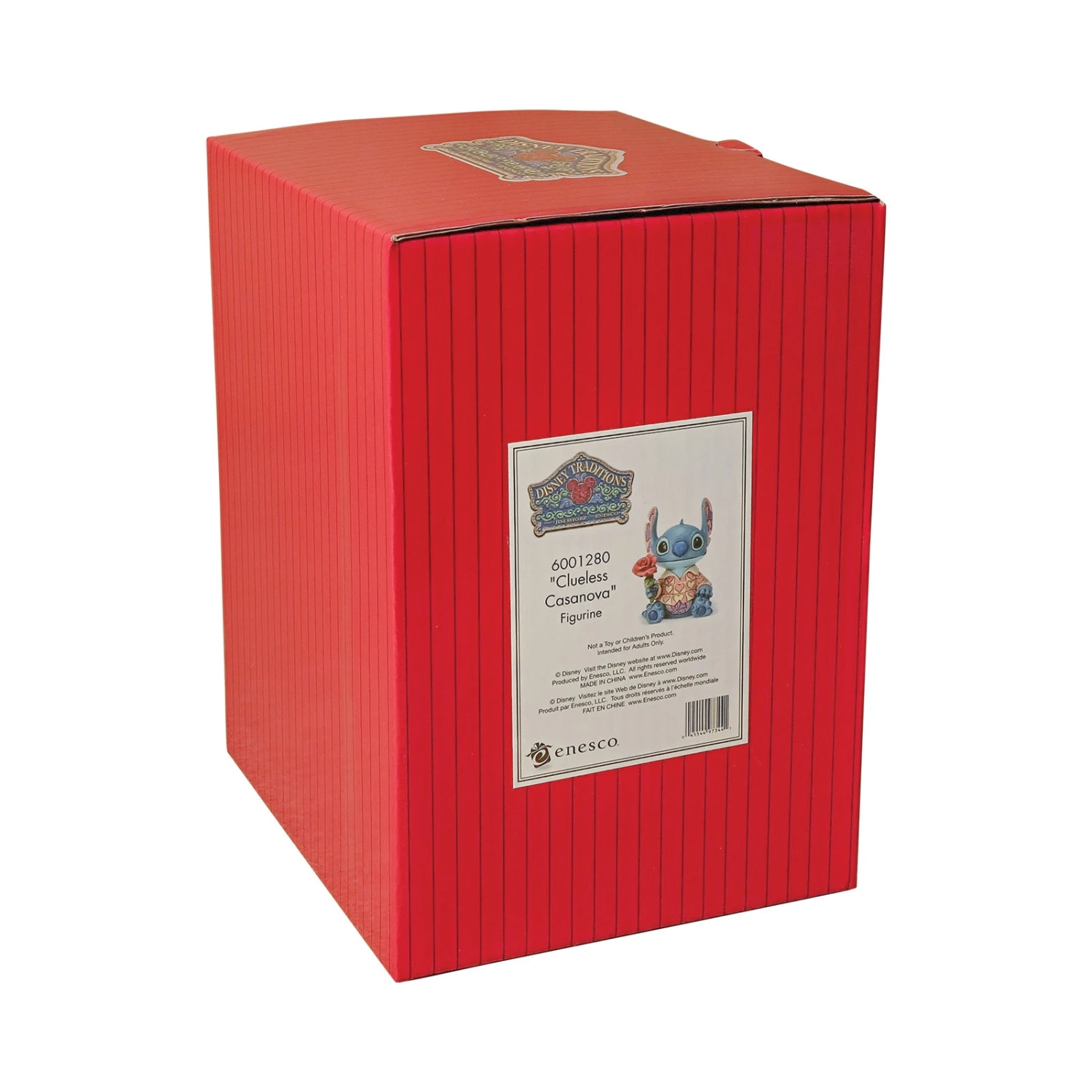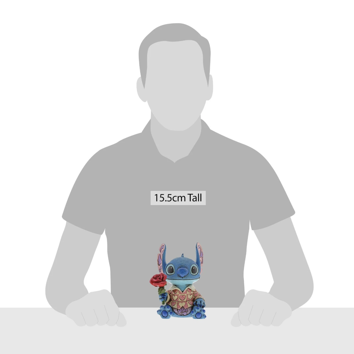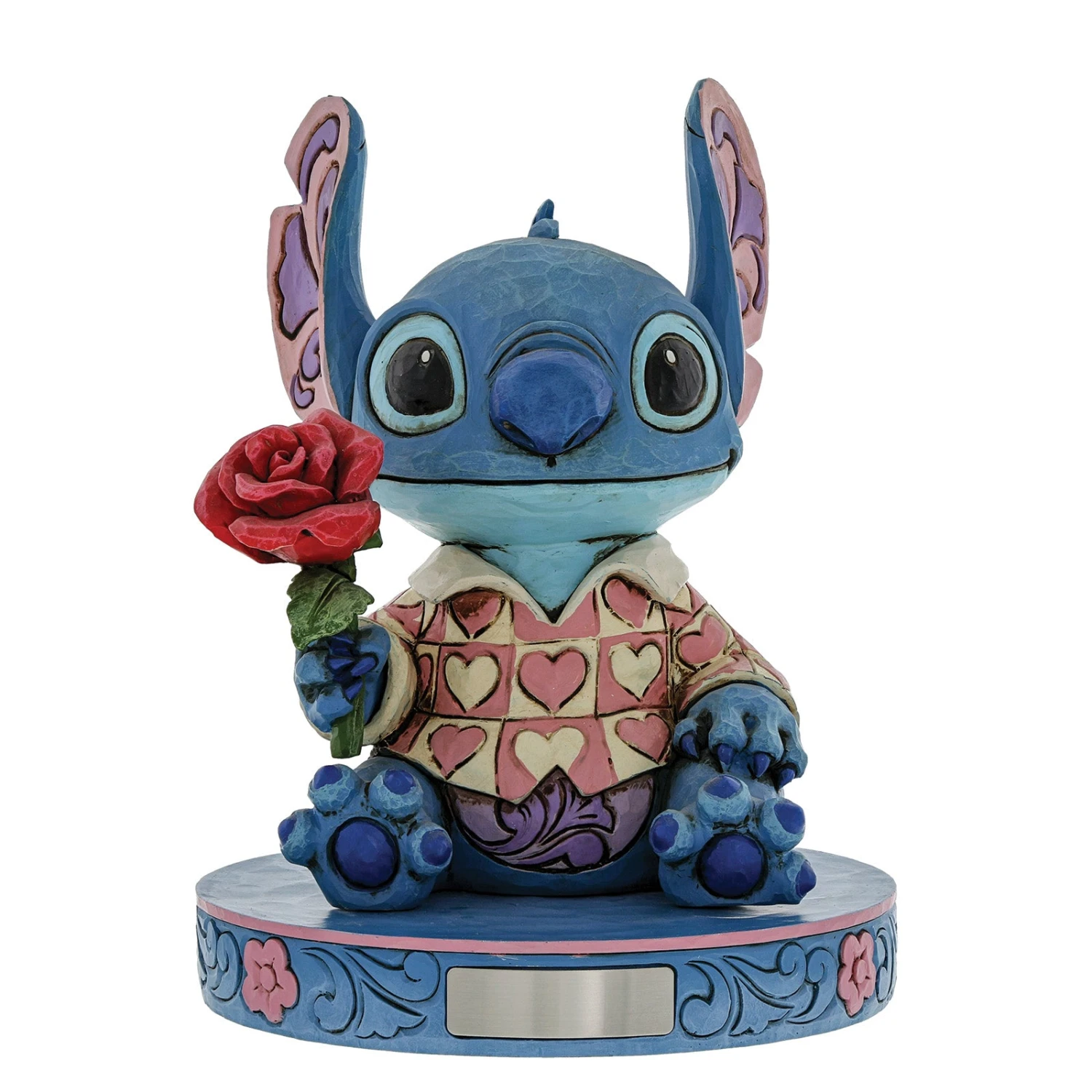 Stitch has transformed into a model citizen that Lilo would be proud of! Designed by Jim Shore, the adorable alien wears a heart-patterned shirt as he offers a single red rose.
