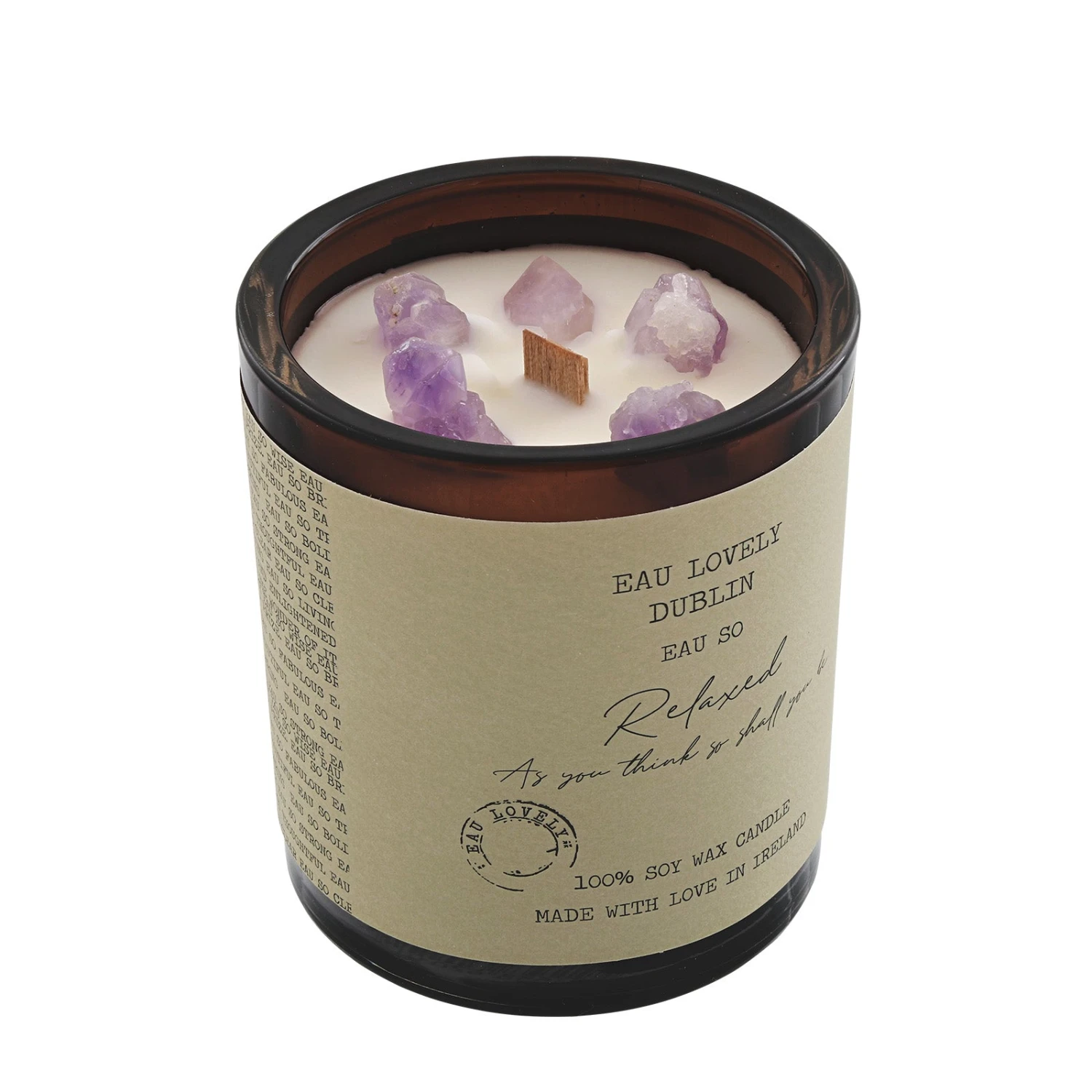 This lovely wood wick candle by Eau Lovely is fragranced with lavender, chamomile and lemon zest, and features amethyst crystals.