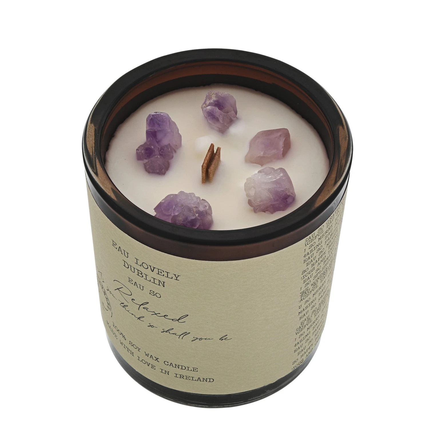 Amethyst is a natural relaxer, it relieves stress and strain, soothes irritability, balances mood swings, dispels anger, rage, fear and anxiety. Alleviates sadness and grief, and dissolves negativity. The perfect candle for times of worry.