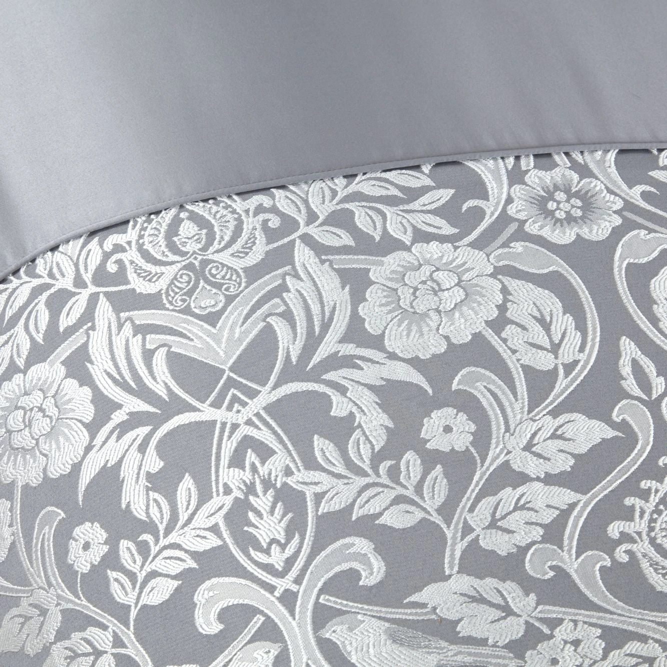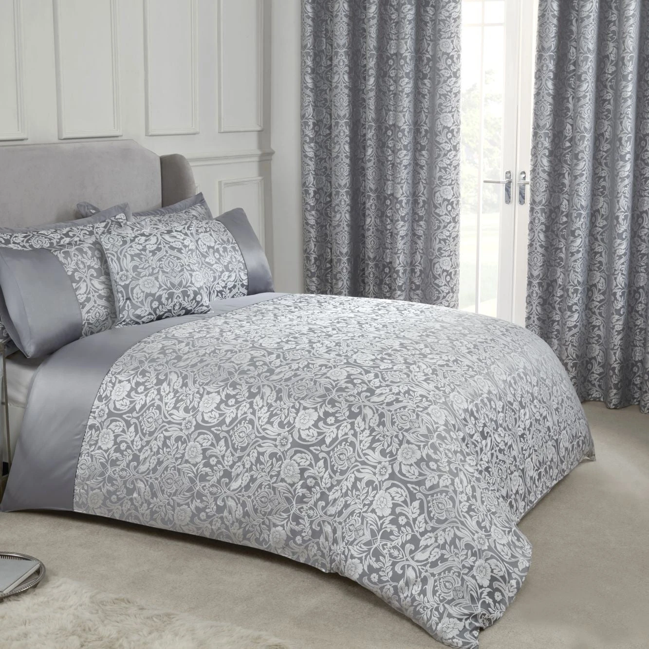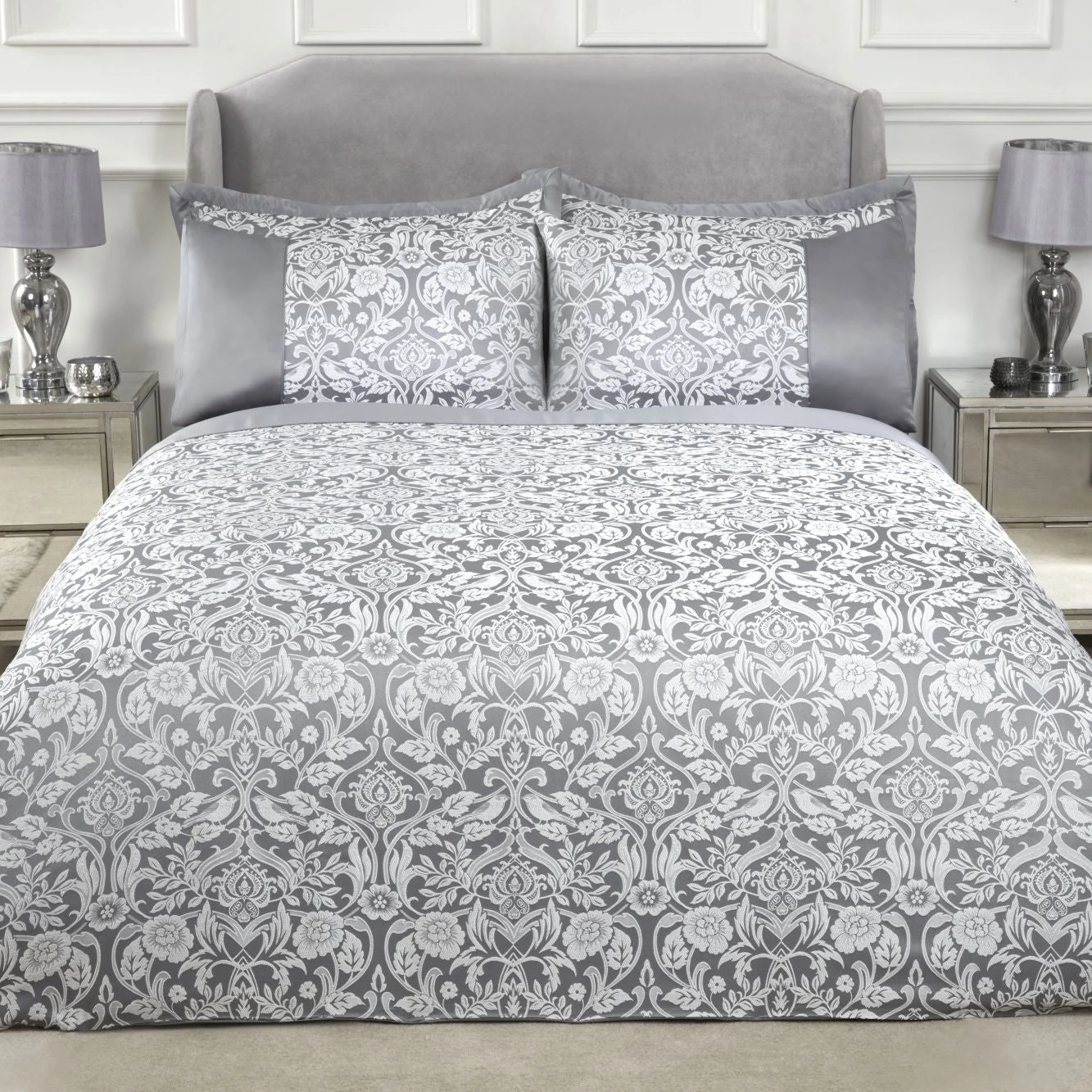 Introducing Silver Eden Embellished Jacquard Duvet Set. Treat yourself to a light and whimsical floral trellis design as you slip into a luxurious experience for a wonderful night’s rest.