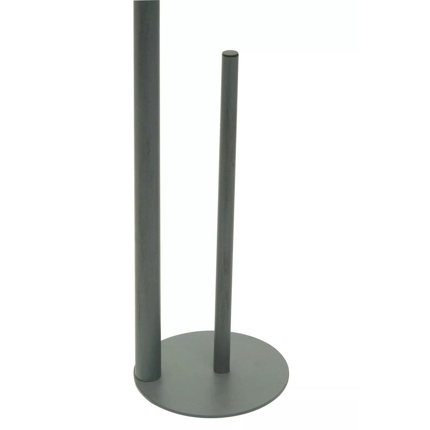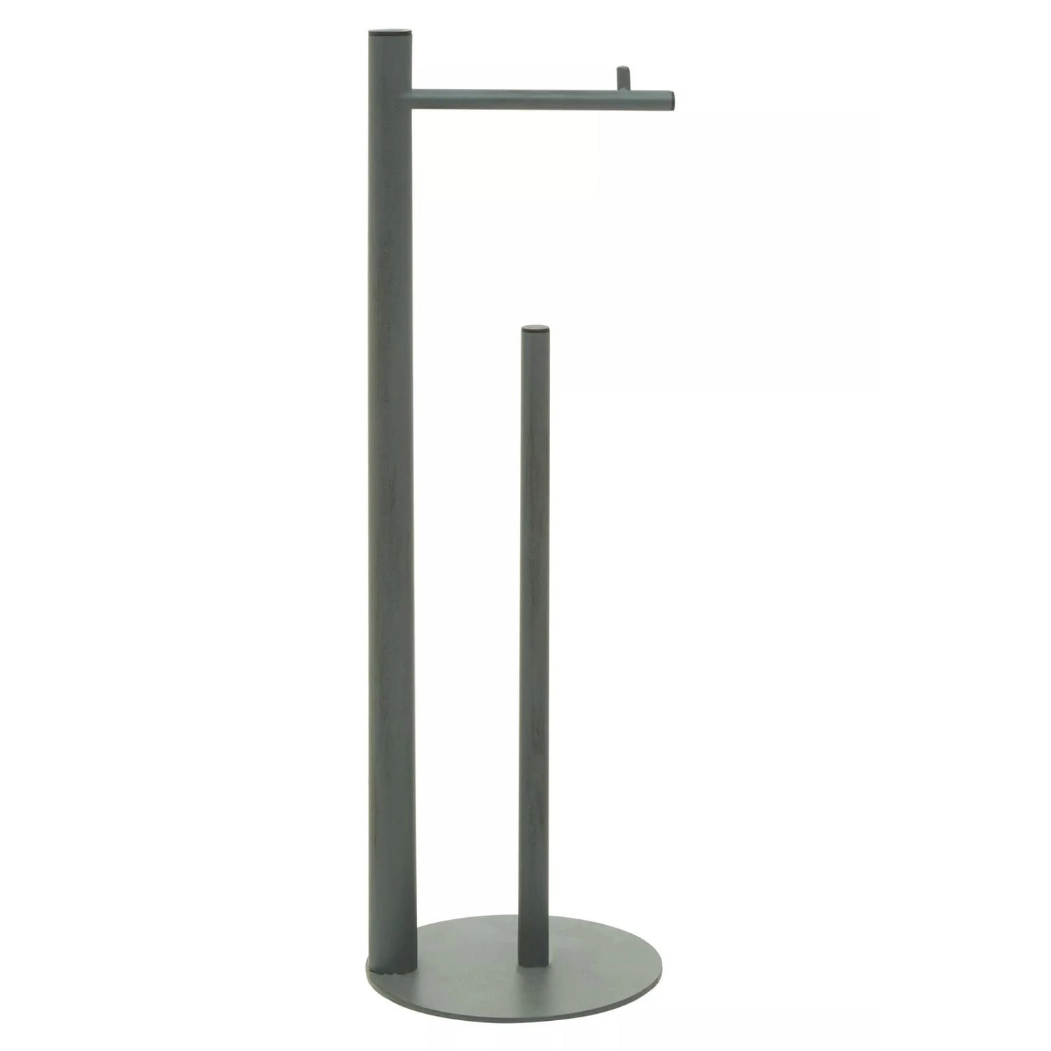 This free-standing toilet roll holder is made from sturdy metal and given a grey finish. Boasting a minimal shape, this roll holder has two angular poles fixed neatly on the round base for added stability and suits a wide range of decors.
