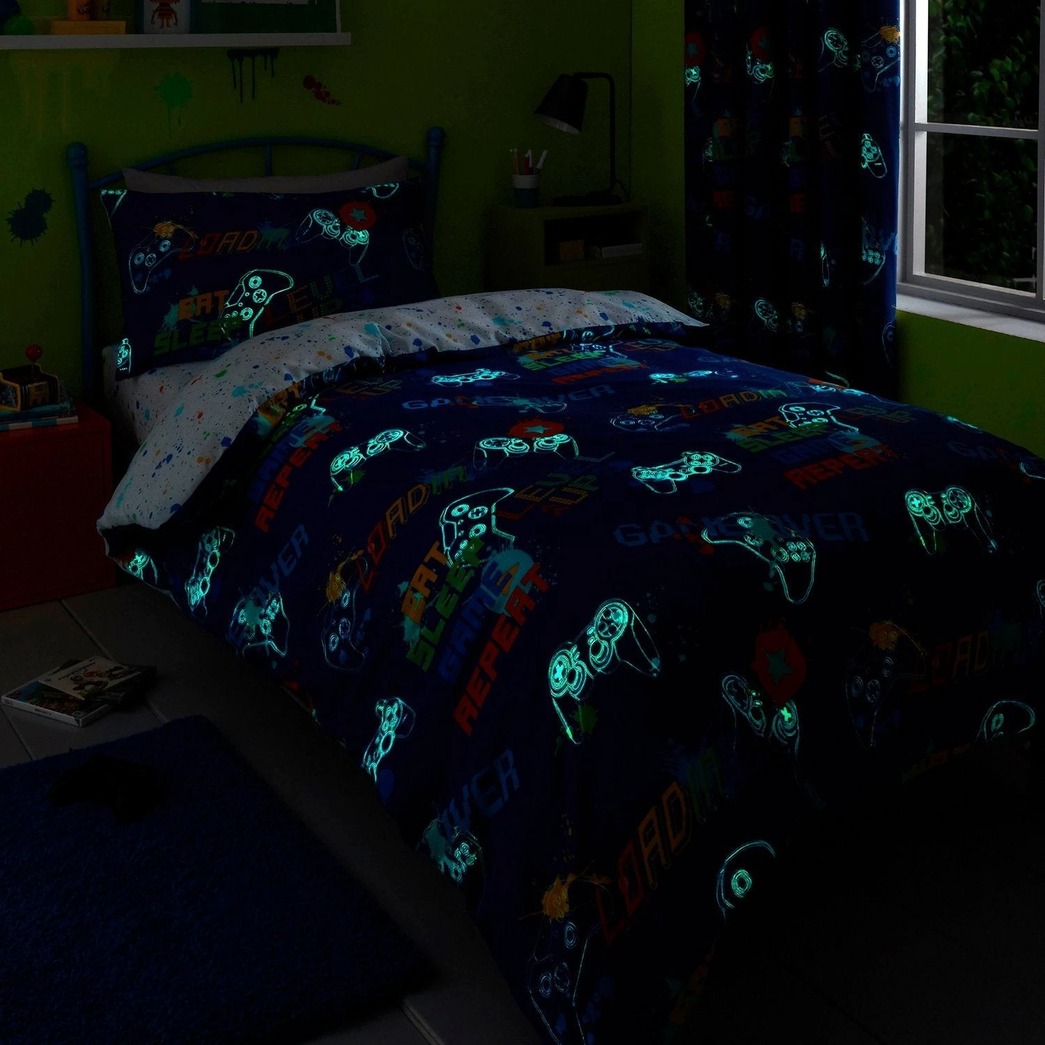 Let the gaming fun begin with this awesome Game Blue Glow-in-the-Dark Kids Duvet Set. This amazing set is sure to give your child’s bedroom a major upgrade. They’ll love having all the gaming slogans, illustrations and glow-in-the-dark splatter print on their bedding.