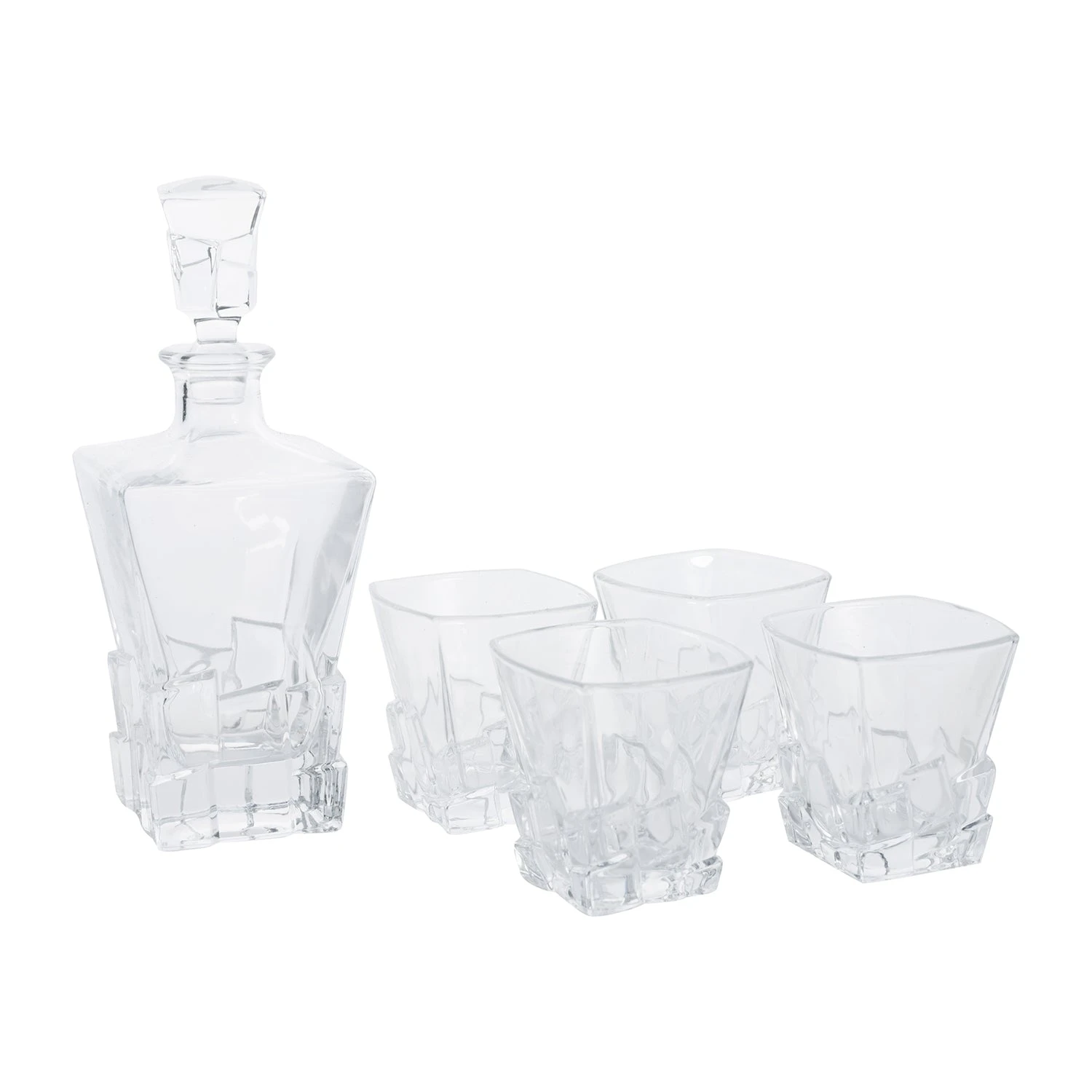 The stunning crystal glass decanter showcases intricate design which stands out within its wooden pine box. The decanter is accompanied by four matching whiskey tumblers with complementary features.