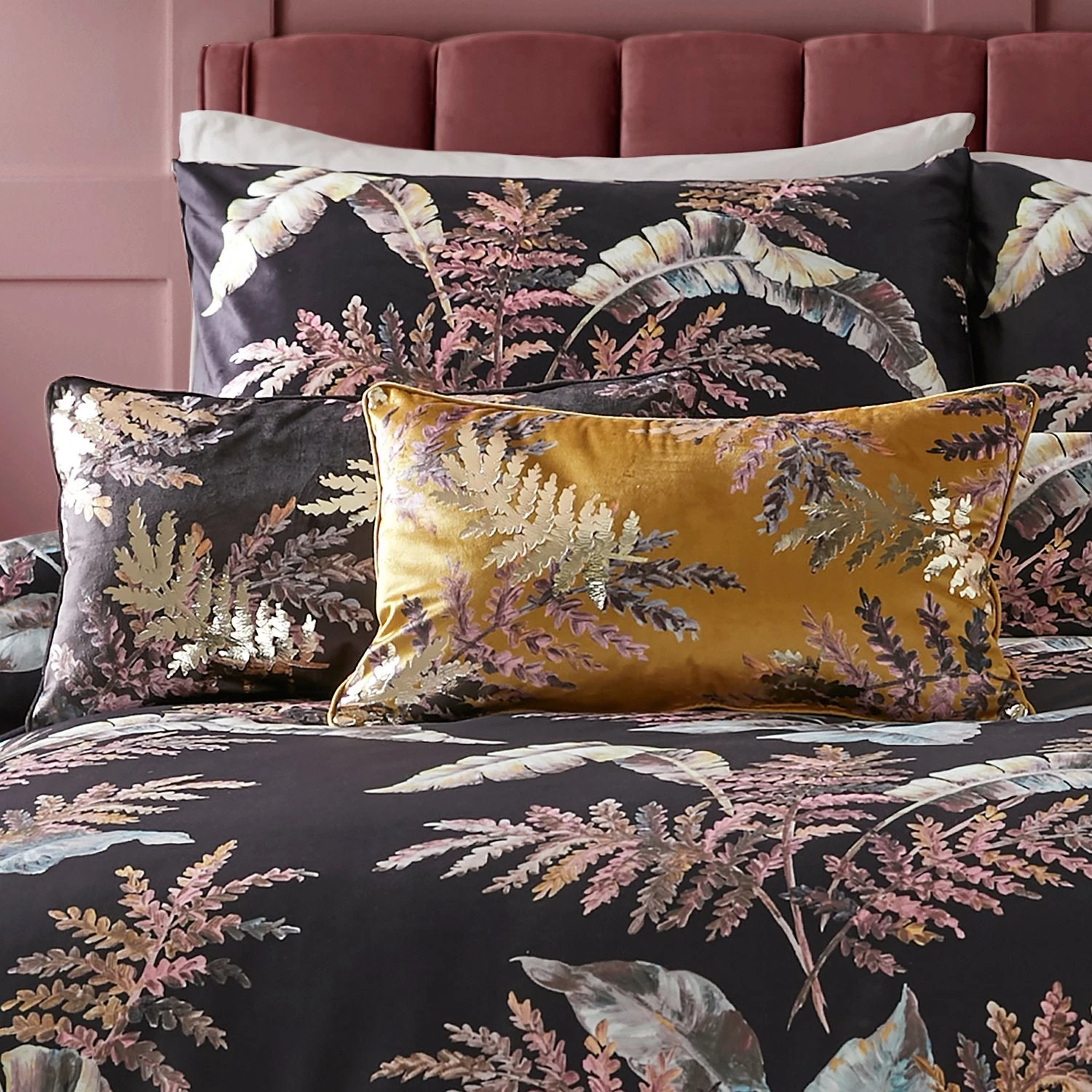 These luxuriously decadent cushions feature a digitally printed leaf and floral design that is enhanced with subtle touches of foil that ensure these velvet touch cushions will look fabulous in any room.