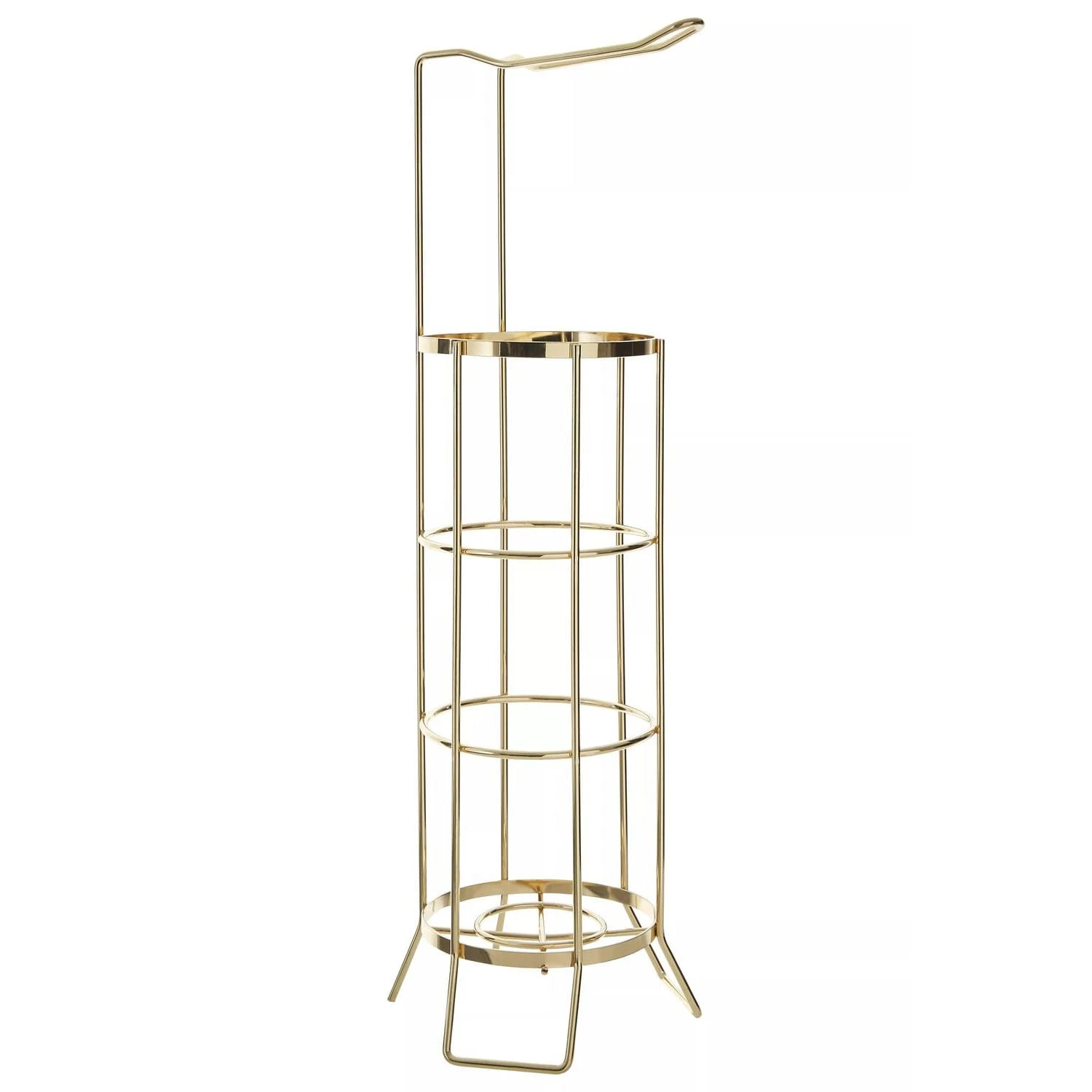 The frame is made from strong iron wire, with a warm and reflective gold finish that coordinates with other metallic bathroom fittings and accessories. Three slanting legs keep it stable and upright, while its cylindrical design makes it easy to deposit additional rolls. A raised arm extends outwards at the top for easy access to toilet paper.