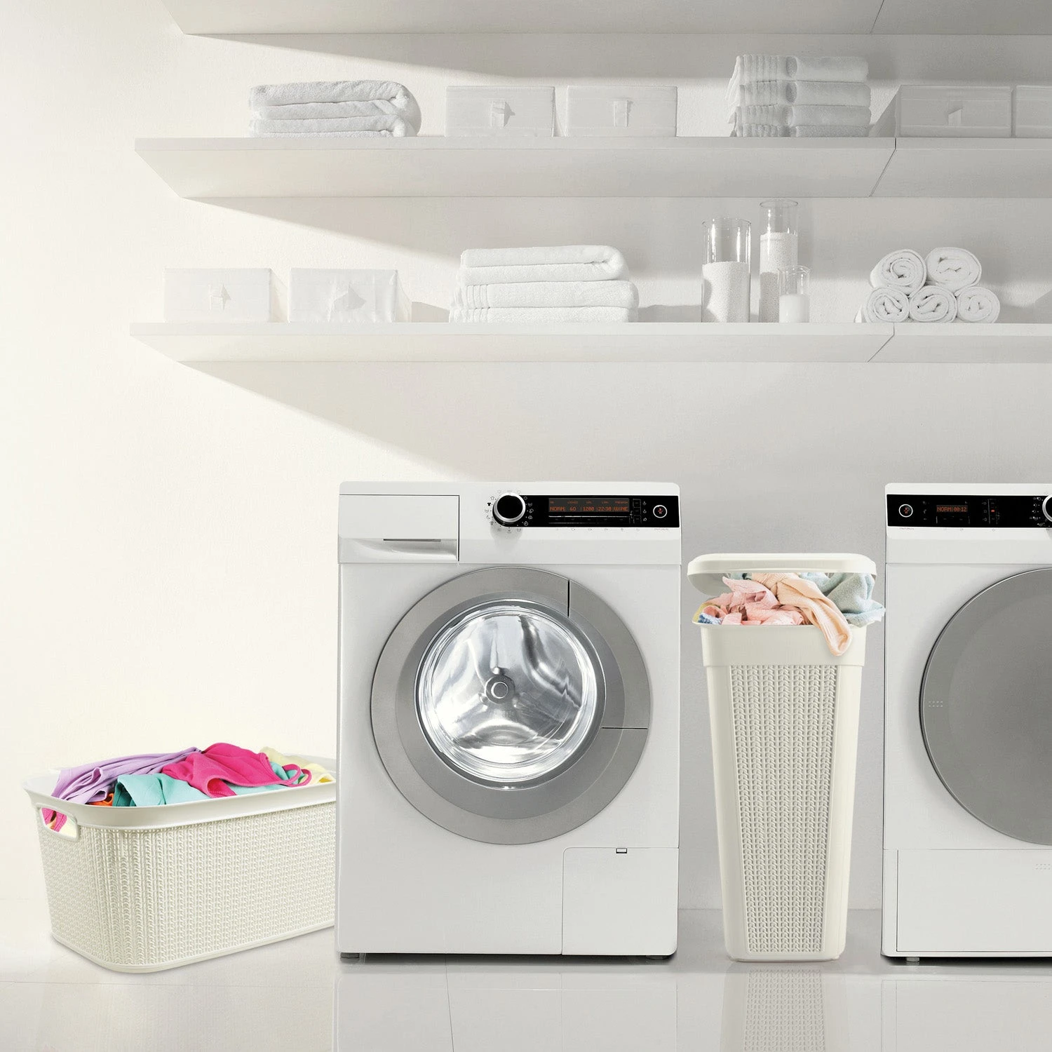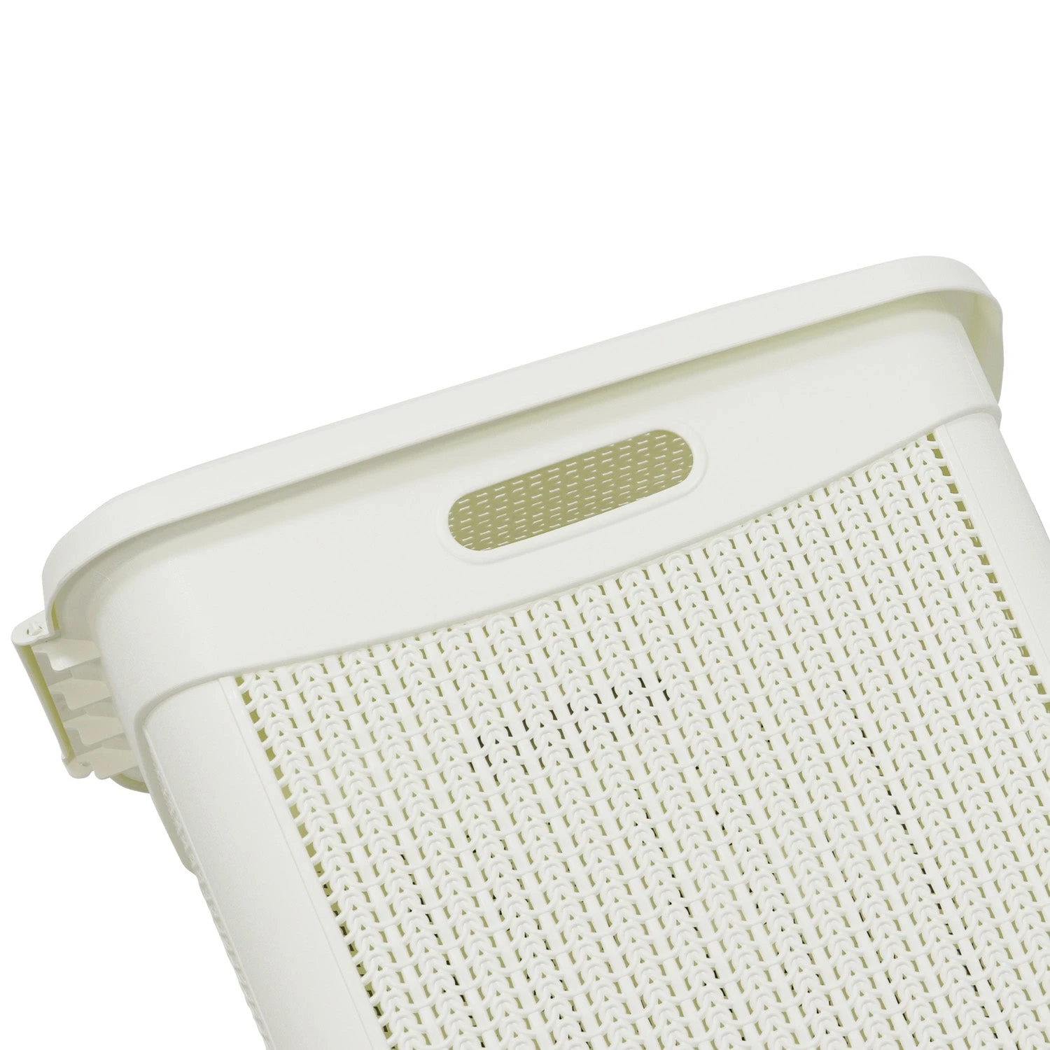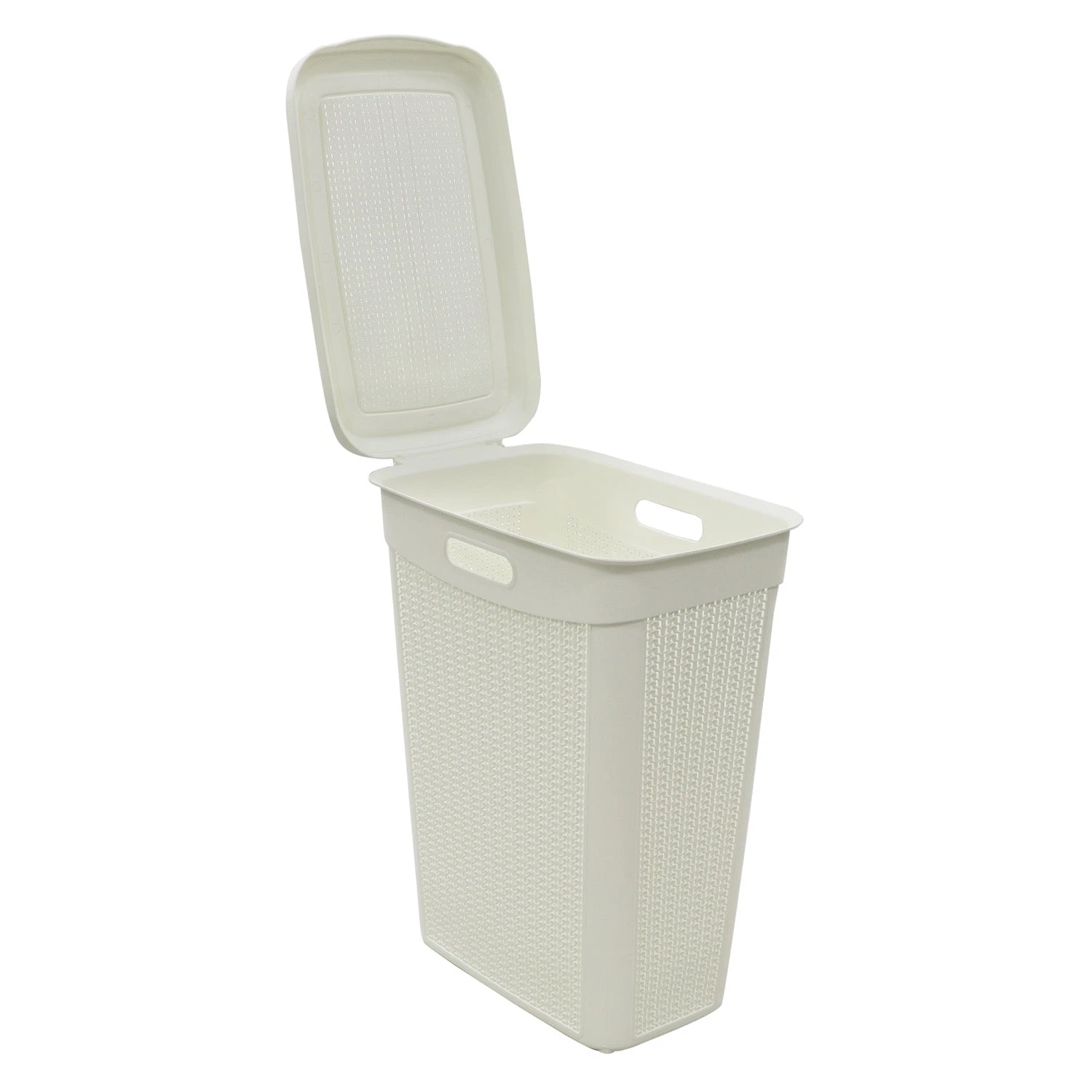 This laundry basket features a knitted loop design in the colour ivory white to complement any home decor.