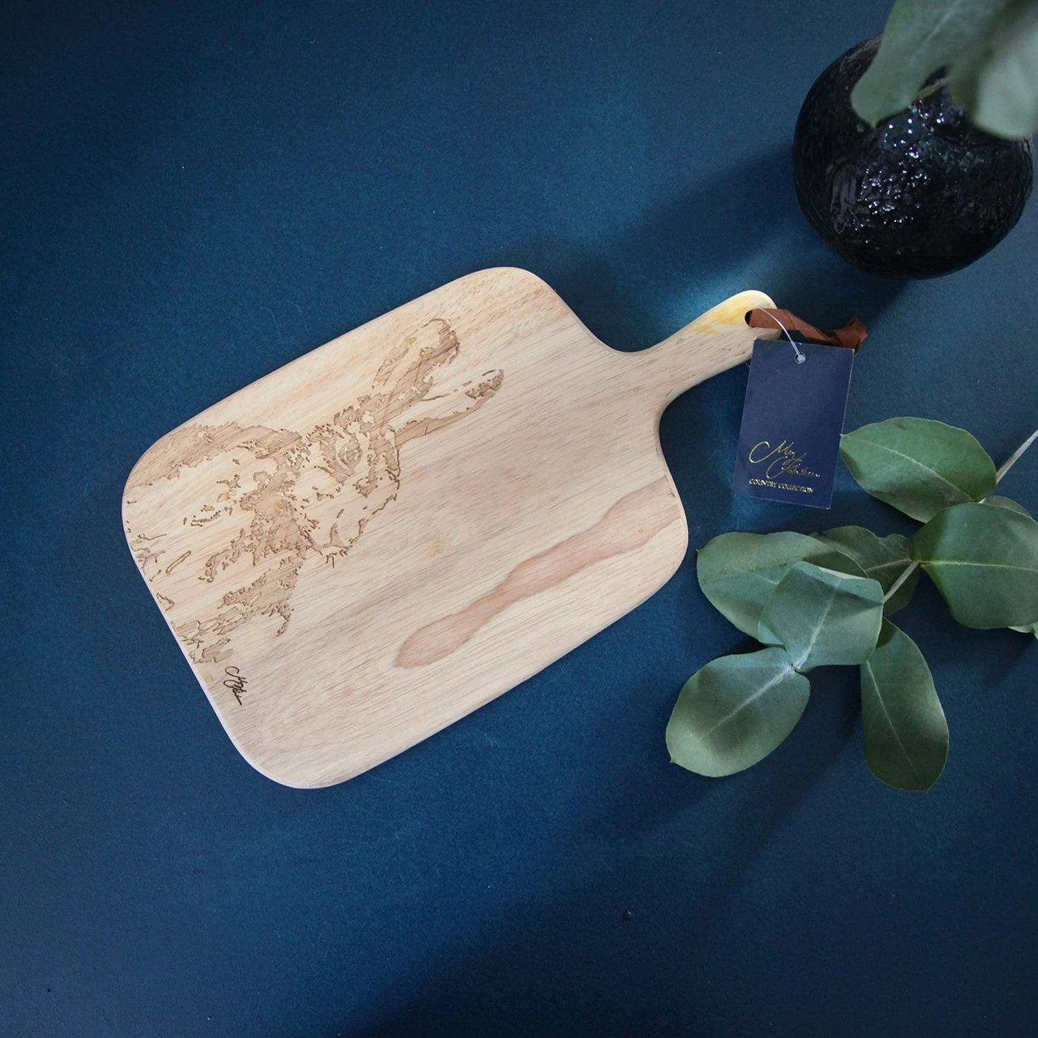 The rectangular, wooden board showcases rubber wood with an integrated handle. It is finished by an engraved hare illustration and Meg Hawkins signature.