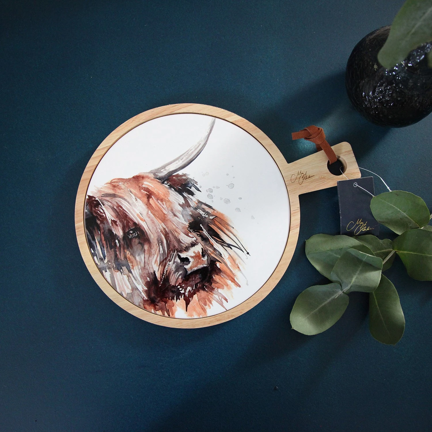 The round, wooden board showcases gloss finish rubber wood with an integrated handle, complete with engraved Meg Hawkins signature. It is finished by an inset white ceramic serving area which is decorated with a printed highland cow illustration.