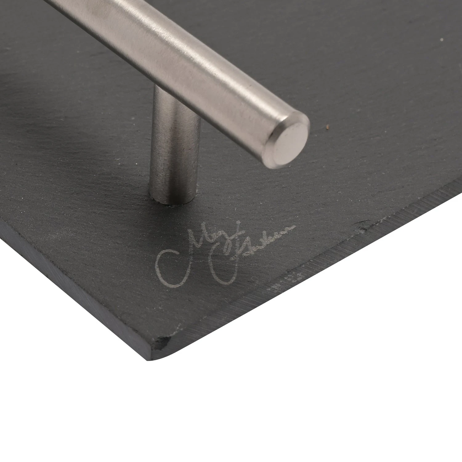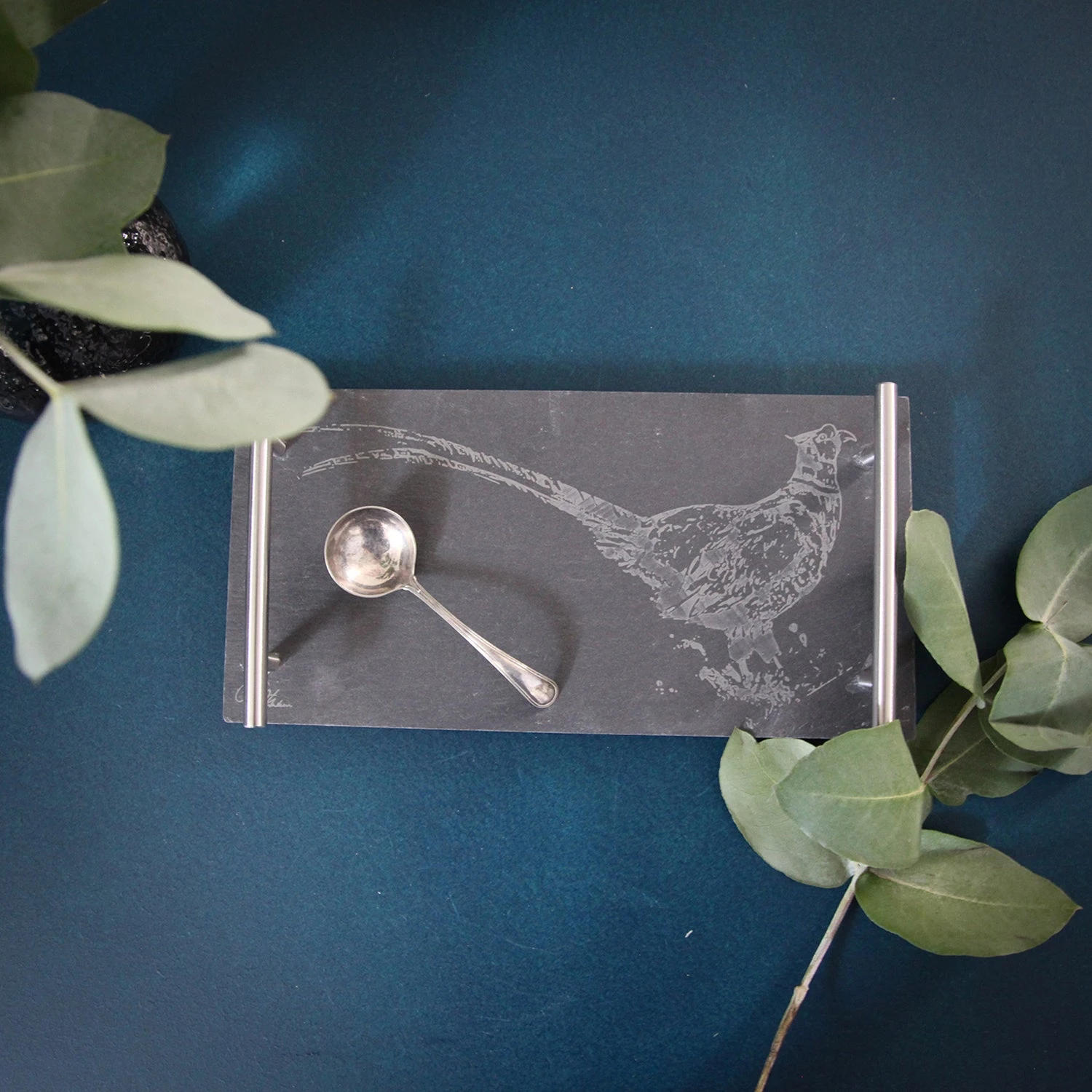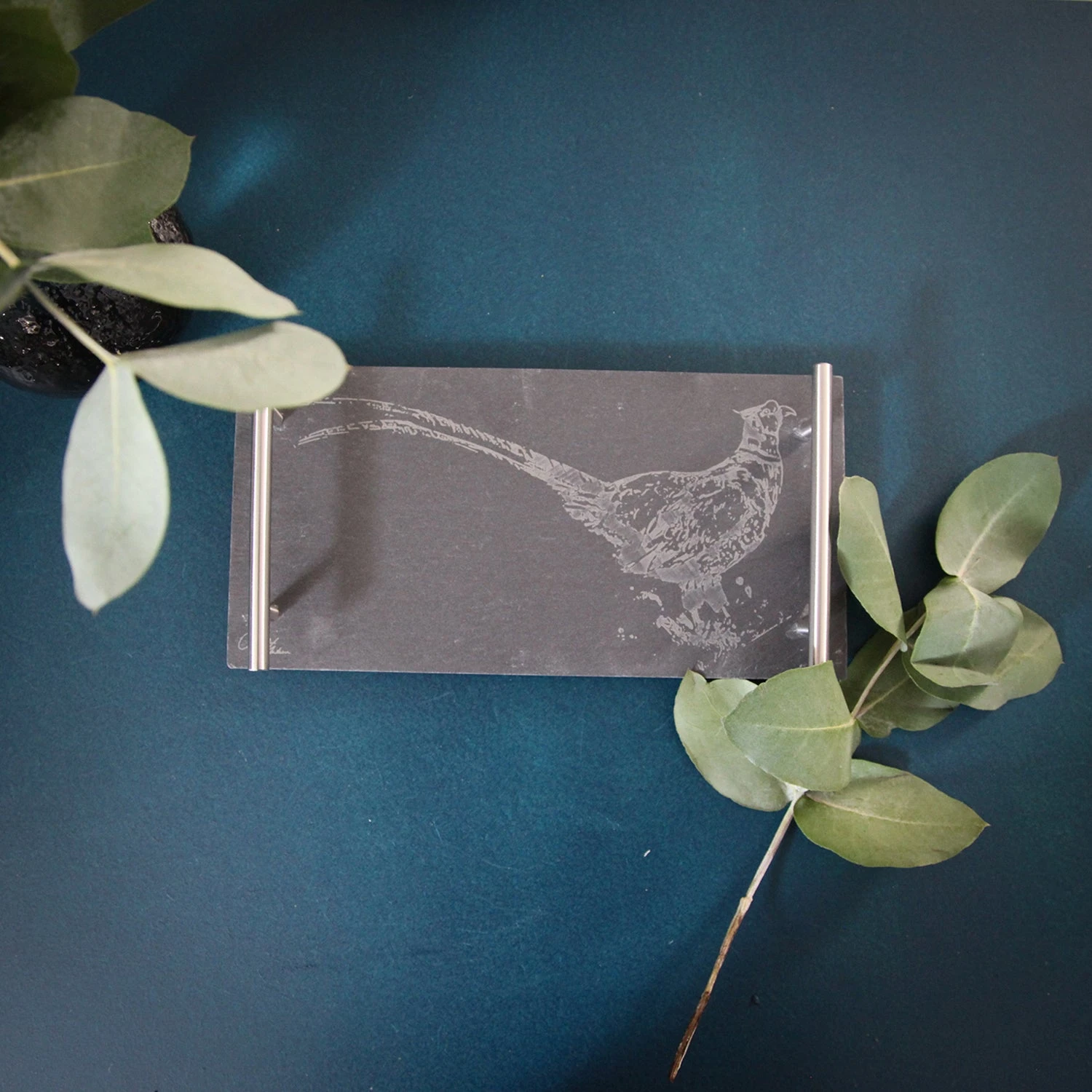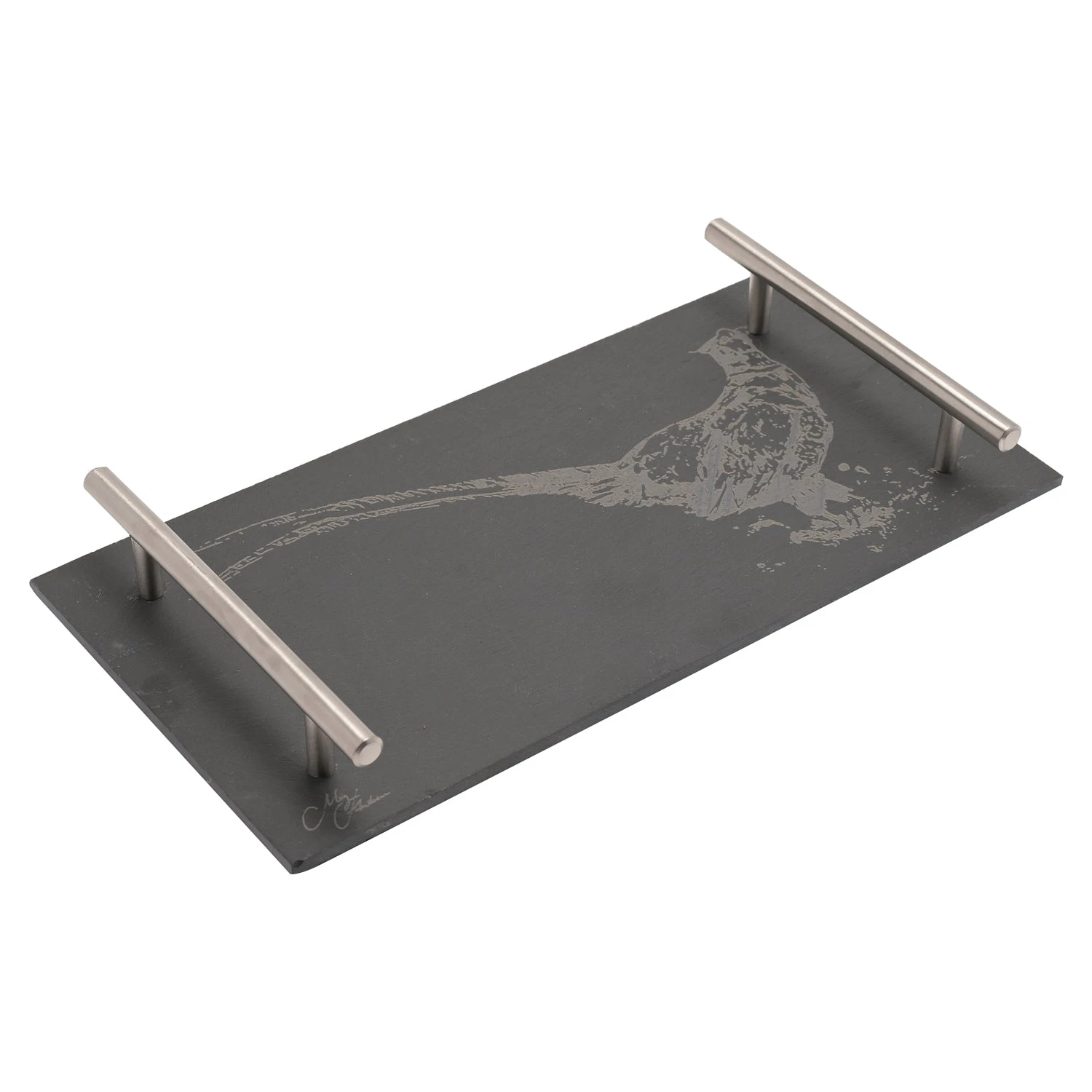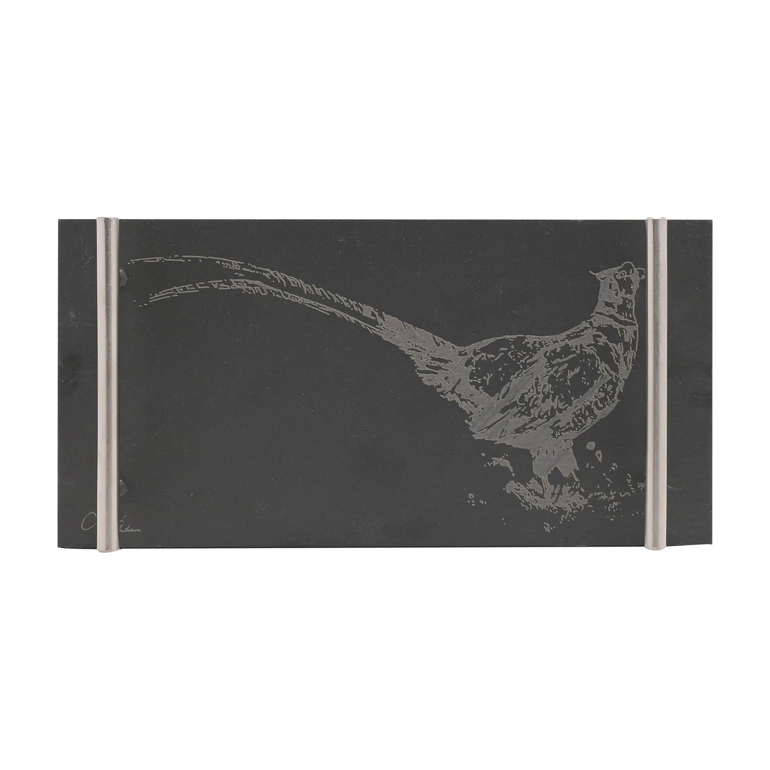 The rectangular, black slate board features a matt finish and silver metal handles on either side. It is finished by a printed pheasant illustration and Meg Hawkins signature.