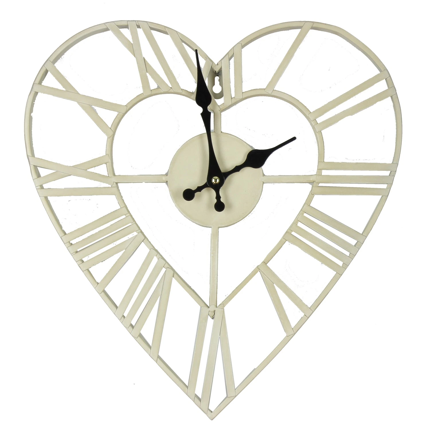 This stylish, shabby chic style metal heart cut wall clock will look perfect on display in any home, and makes a stunning focal point. It features a cut-out heart design with a roman numeral dial and easy to ready black spade hands.