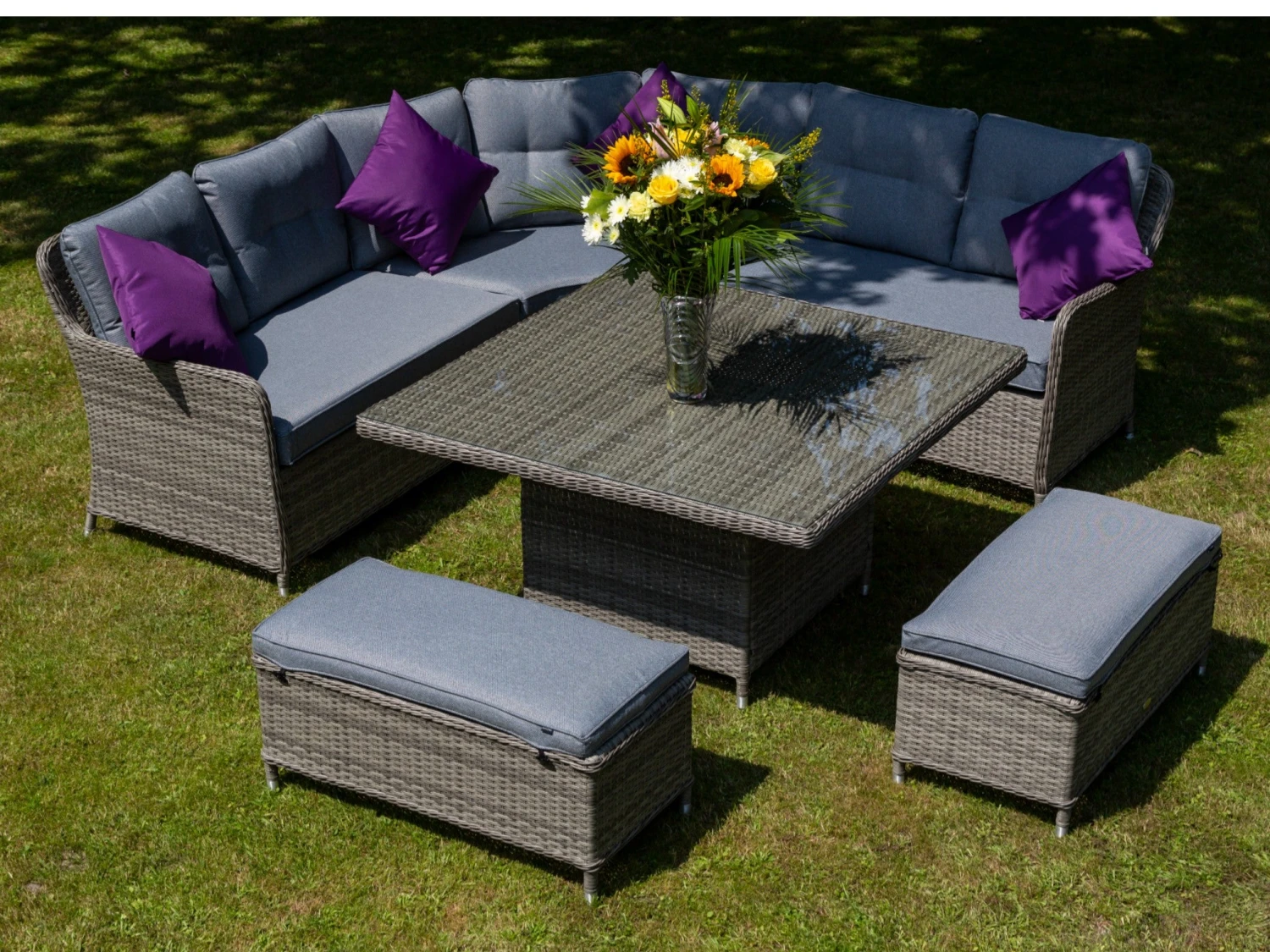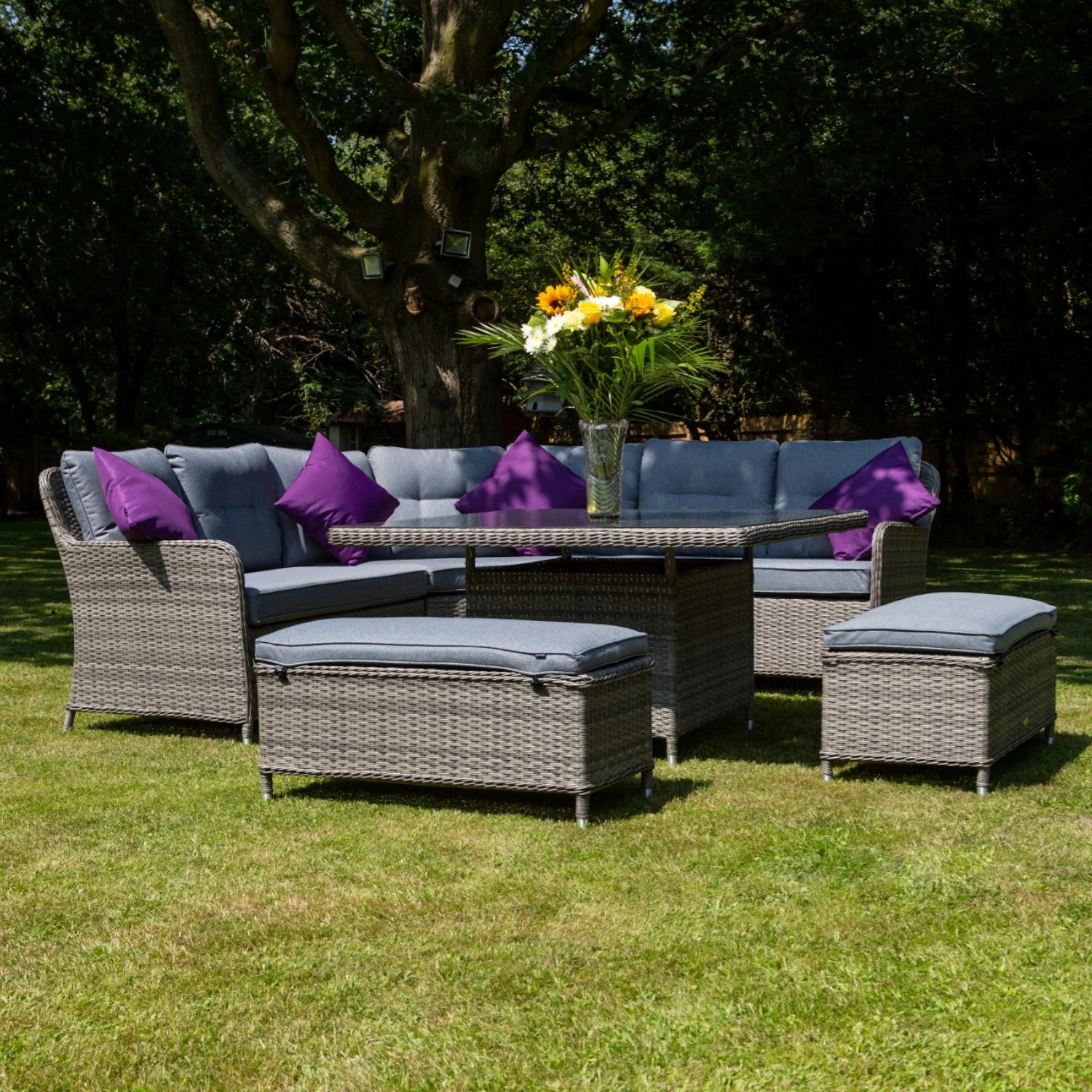 This large, curved corner set offers plenty of space for you and your guests to spread out, and enjoy a relaxing day in the sunshine. With footstools to put your feet up or as additional seating and a large 123cm square table, you have the ideal place to relax, entertain, and host friends.