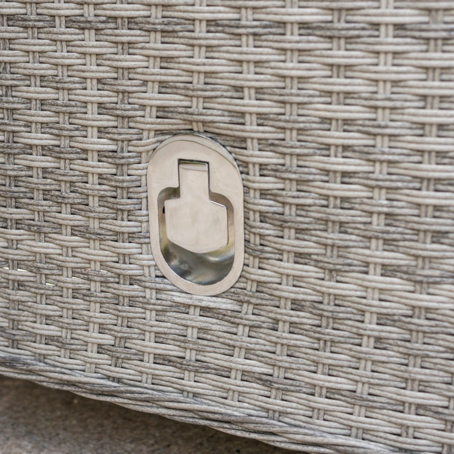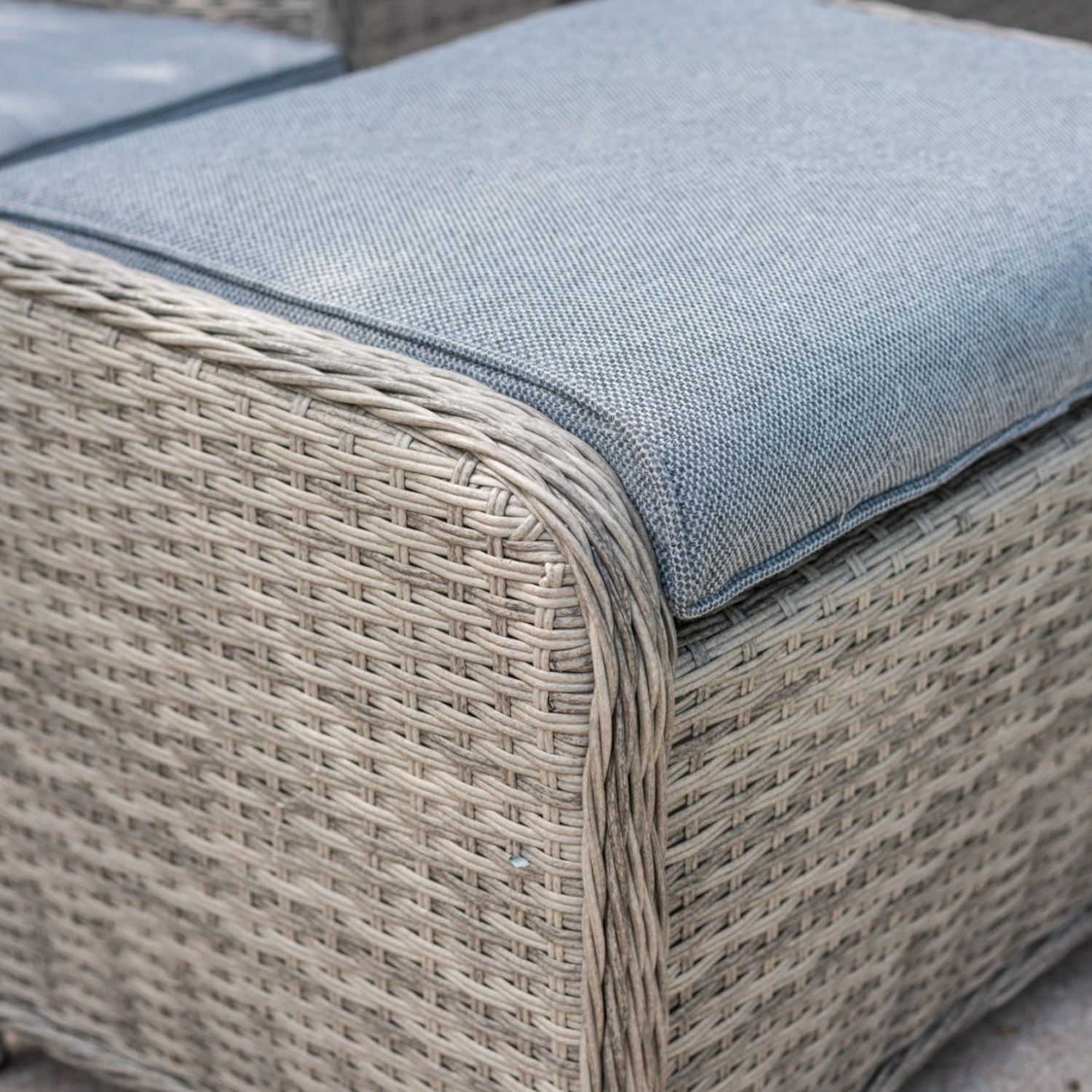 The contemporary design features a soft grey colour woven hand woven onto lightweight aluminium frames to complement grey/blue shower-resistant cushions. Details such as the smooth rounded chair armrests, softly curved cushion, and full round twist weave edging increase quality, strength, durability, and refinement.