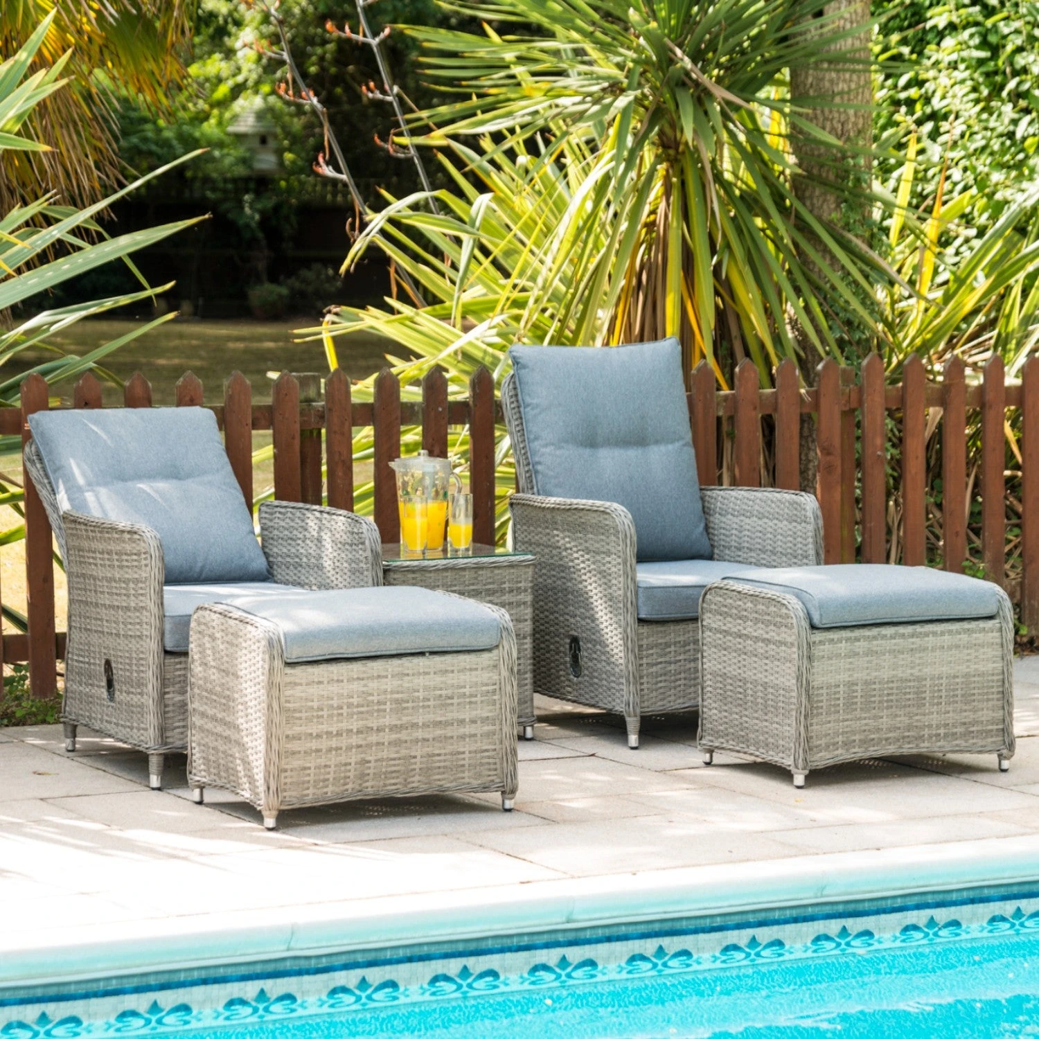 Generously sized reclining armchairs with complimenting plush cushions, two footstools, and an accompanying side table with a 5mm easy clean tempered safety glass top