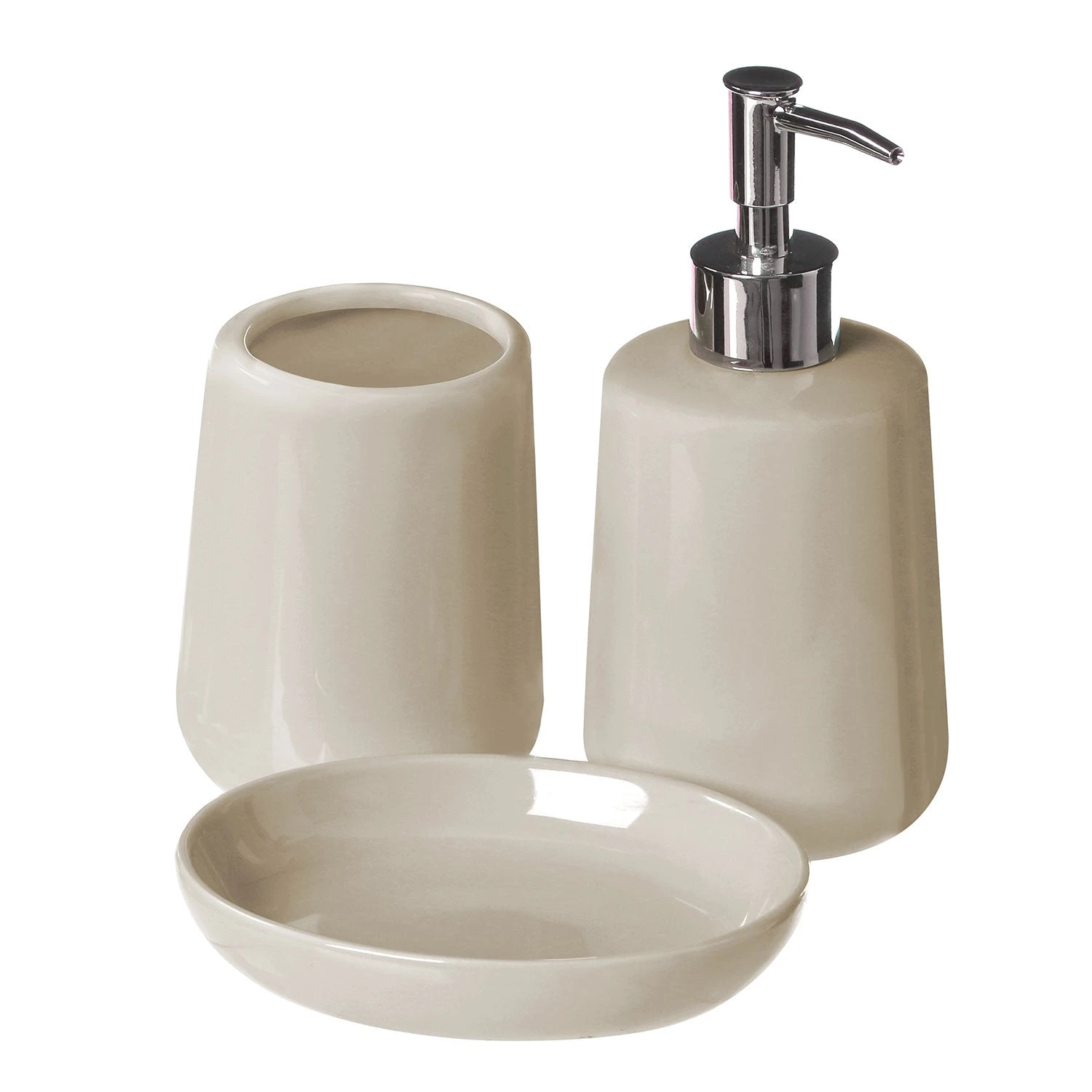 Each piece in this bathroom set is made from robust dolomite and features a natural toned ceramic finish. The reflective coating gives the set a touch of contemporary glam and is complemented by metallic hues of the lotion dispenser. The smoothly contoured, rounded edges complete the aesthetically pleasing look.