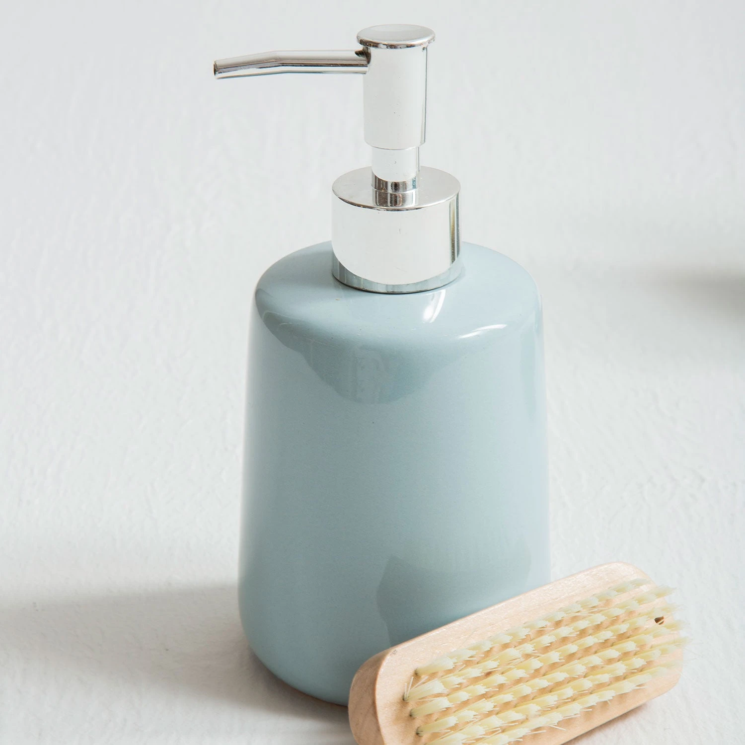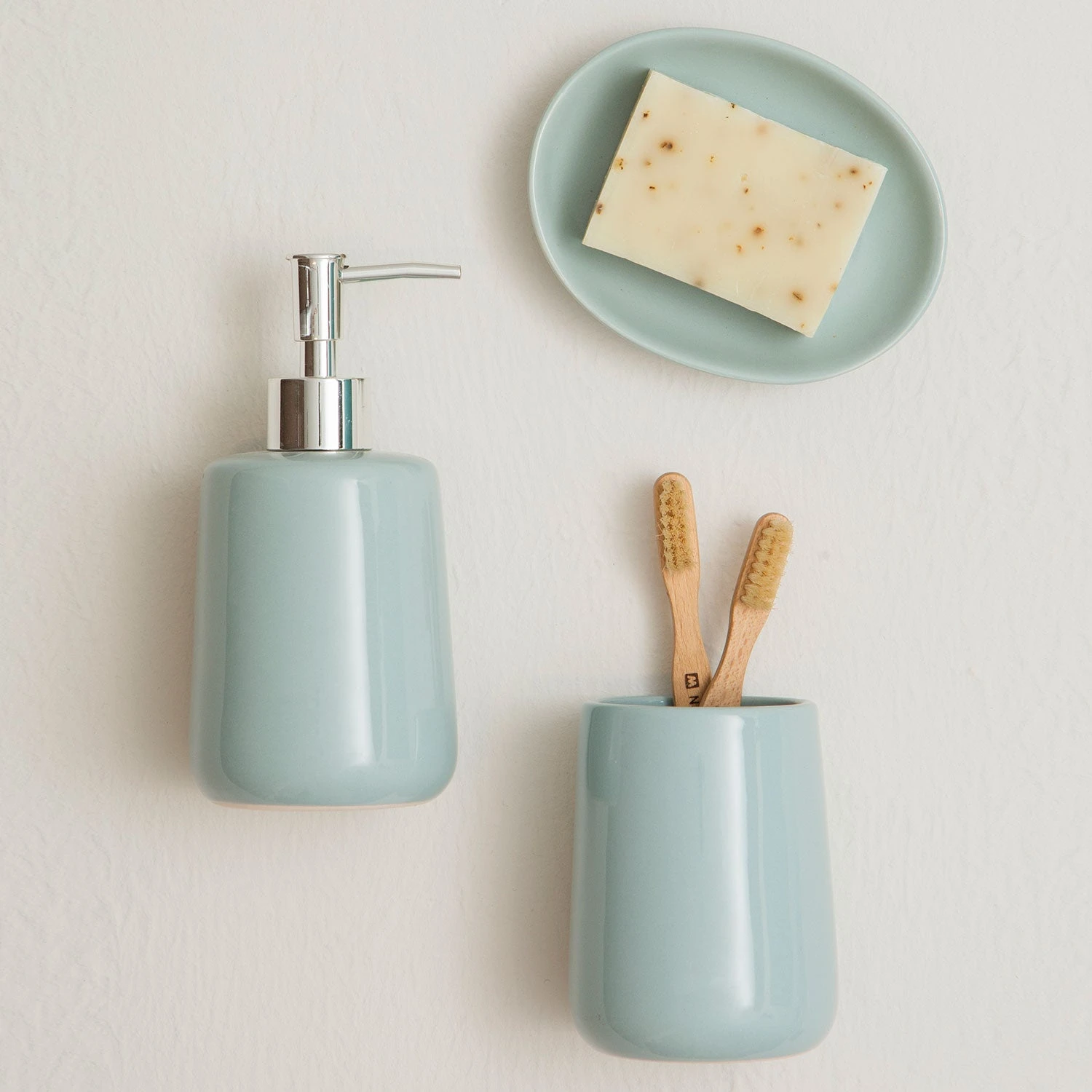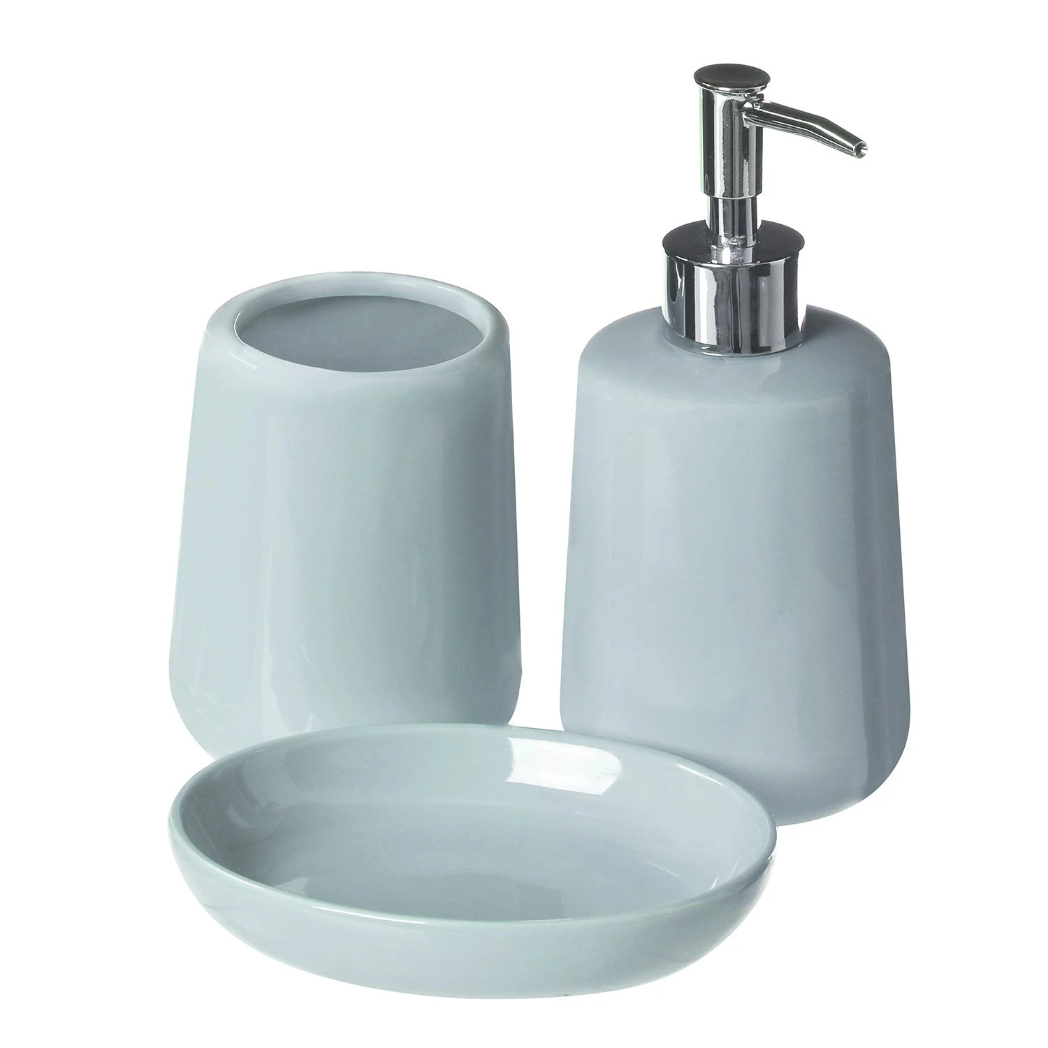 Each piece in this bathroom set is made from robust dolomite and features a pale blue ceramic finish. The reflective coating gives them a touch of contemporary glam and complemented by metallic hues of the lotion dispenser.