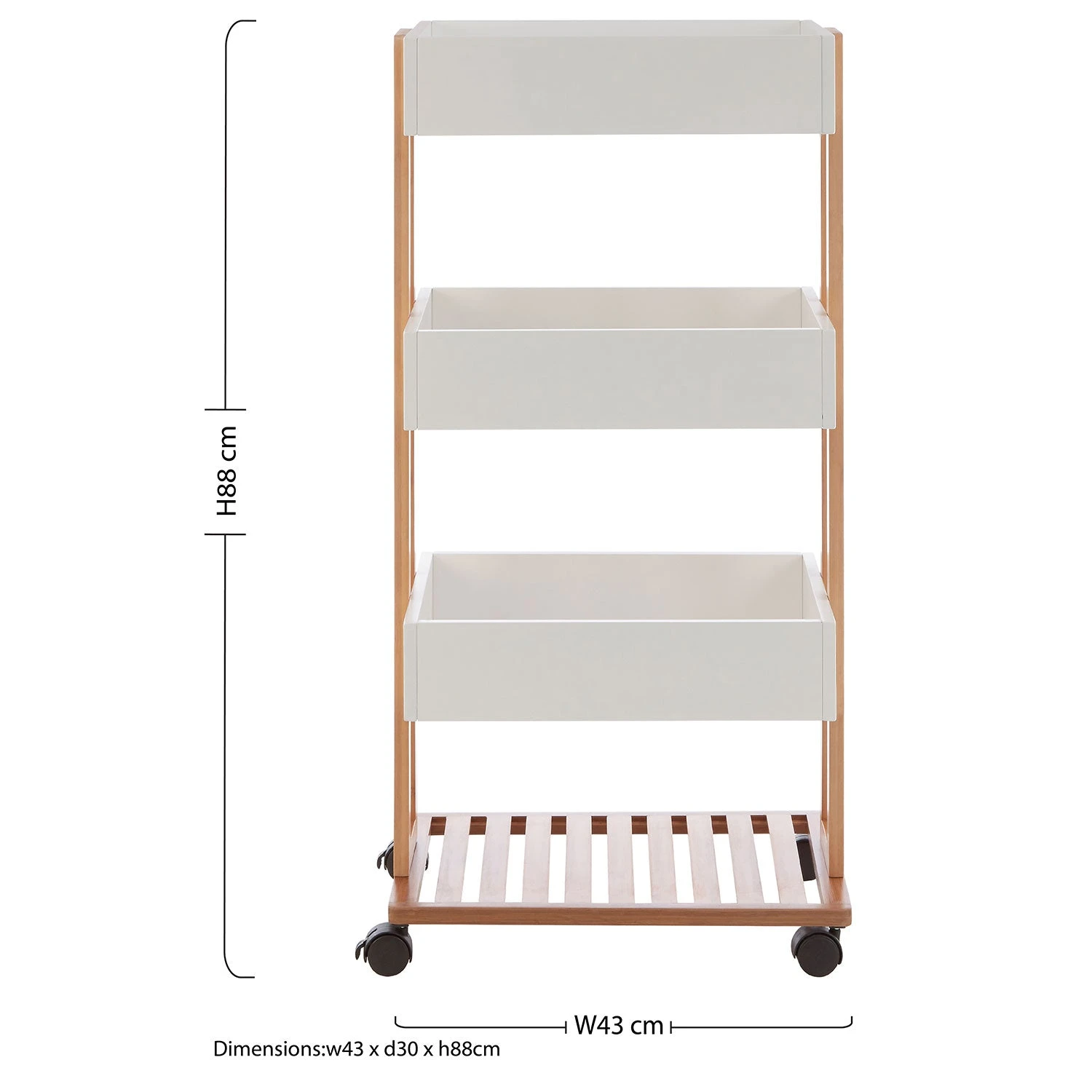 This Nordic style trolley has a modern look featuring three shelves with raised edges providing ample storage space. The shelves sit in a renewable bamboo frame that is contrasted with the chic white colour. The lower shelf is matched with the natural accent featuring an open, slatted base for organising towels or linen completed with caster wheel.