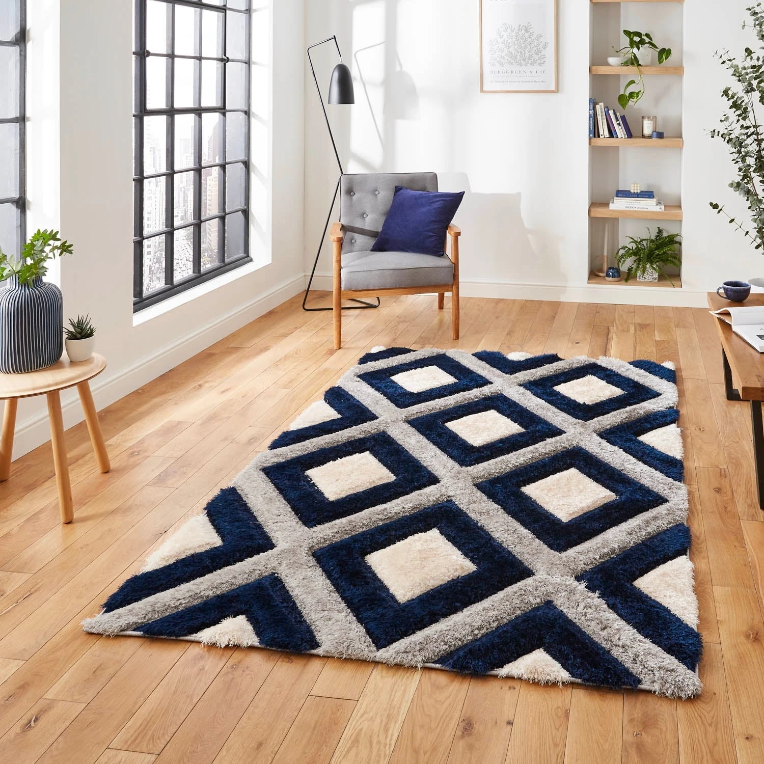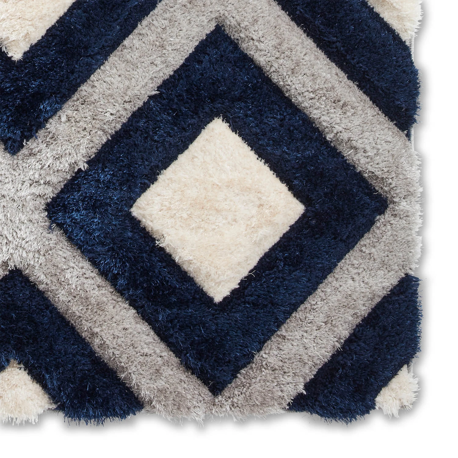 Discover the captivating Olympia Grey/Navy Geometric Rug, meticulously hand-carved from a blend of polypropylene and polyester. The contemporary geometric design comes to life with its enchanting 3D effect, adding depth and dimension to any space!