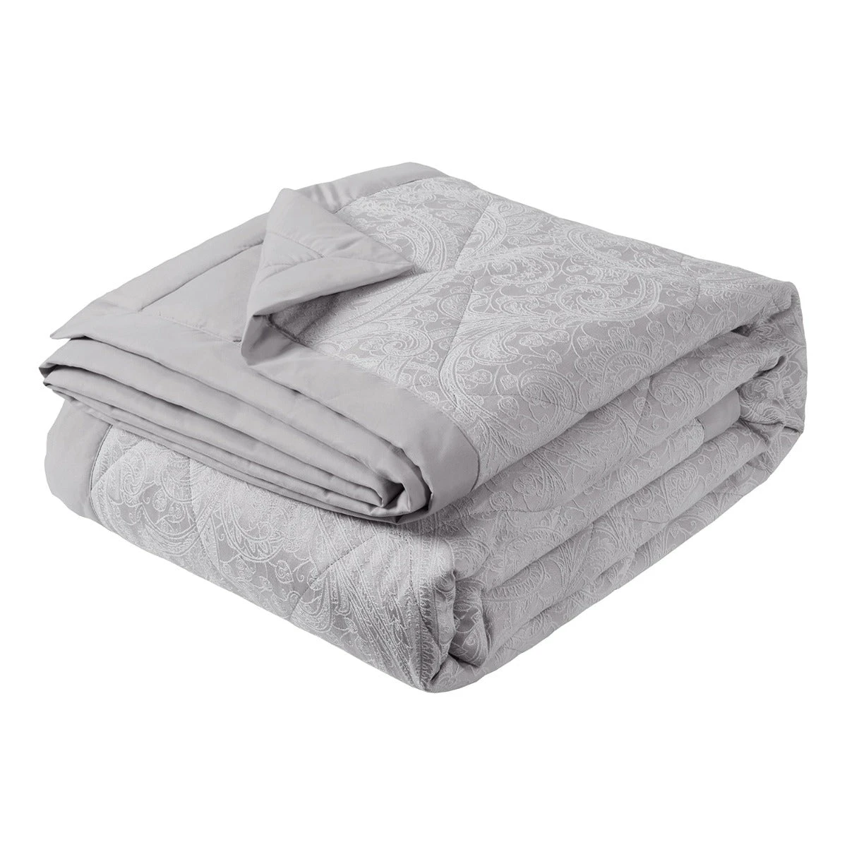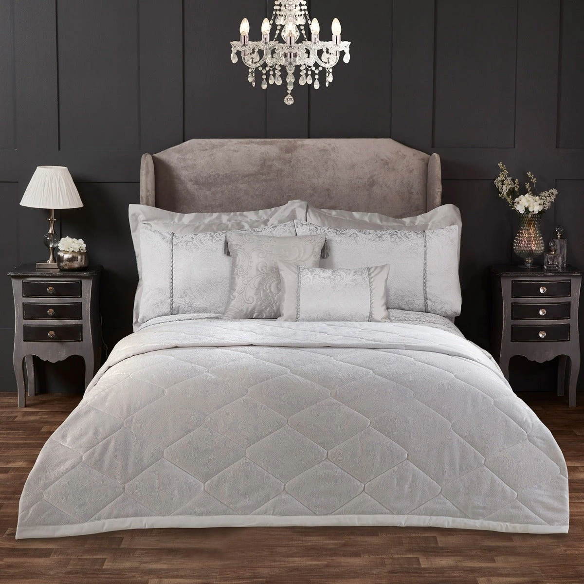 Featuring an intricate paisley design in stunning silver, this generously sized bedspread is quilted into diamonds and provides a stunning way to layer up your bed. The bedspread has a coordinating duvet set along with a wide range of matching accessories including a throw with corner tassels, a boudoir cushion, a square cushion with corner tassels and housewife and oxford pillowcases. Combine all of the elements to create a beautiful and elegant statement look in your bedroom.
