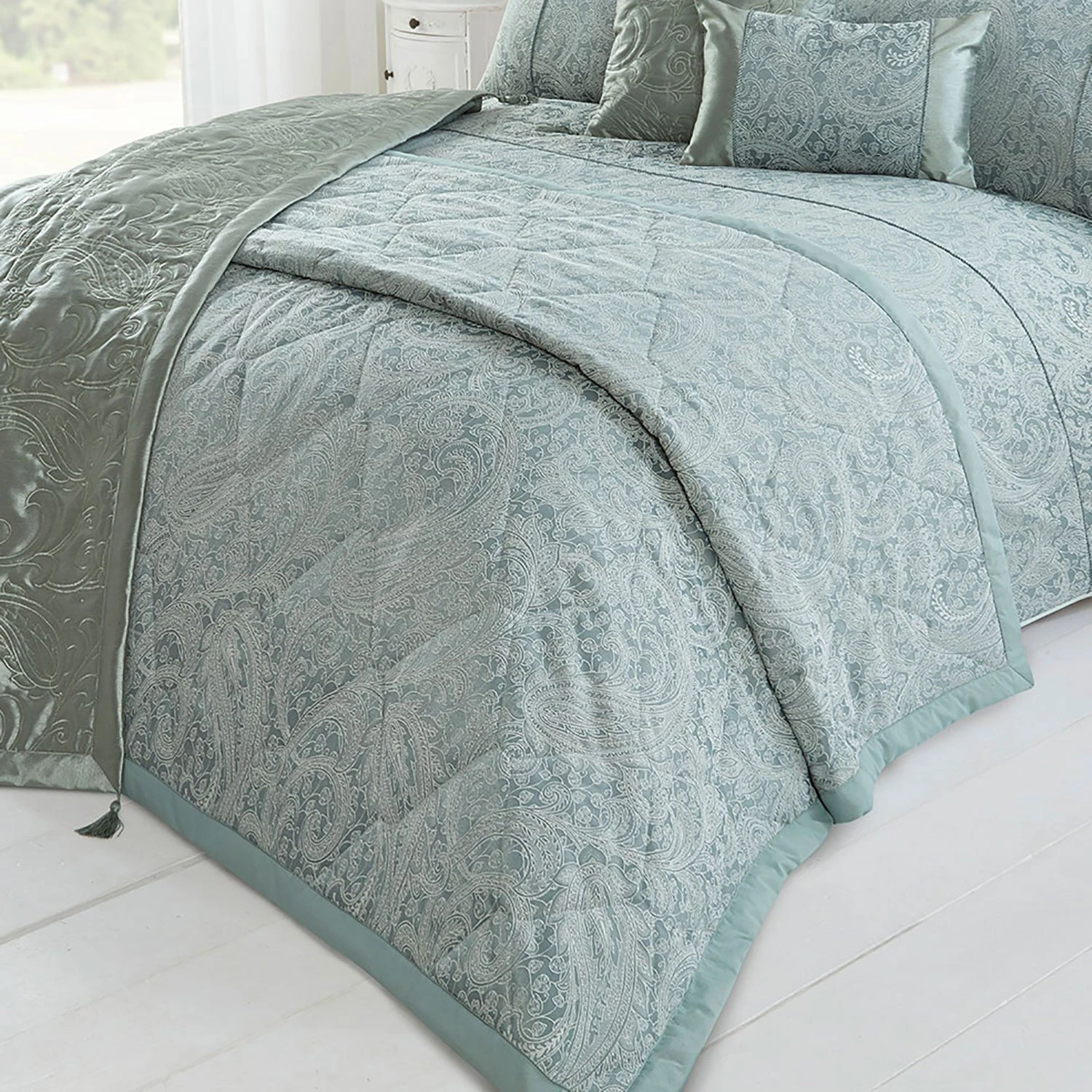 Featuring an intricate paisley design in rich soft green tones, this generously sized bedspread is quilted into diamonds and provides a stunning way to layer up your bed.