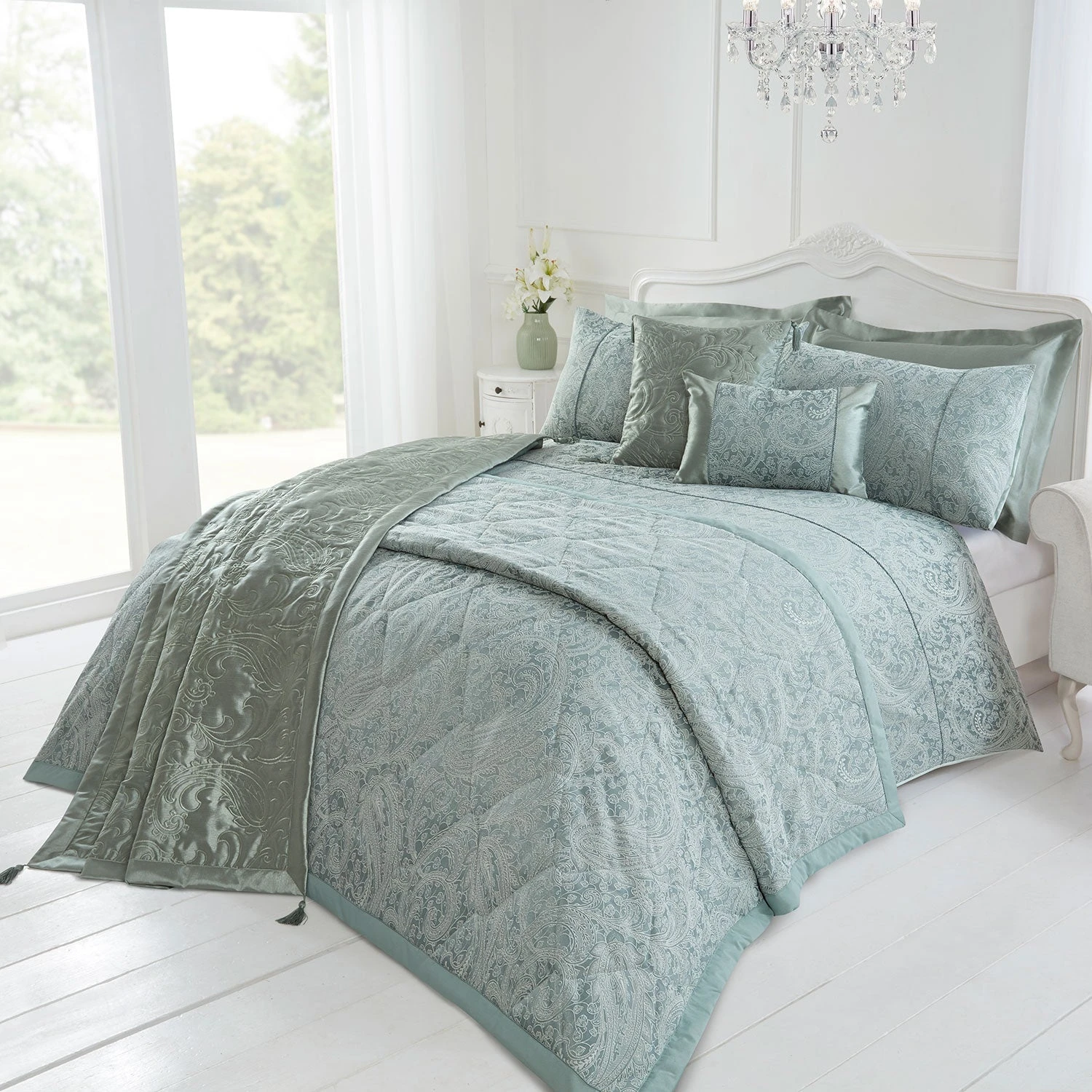 Featuring an intricate paisley design in rich soft green tones, this pretty boudoir cushion features beautiful rope detailing separating the paisley panel from the satin cuffs. The cushion has a coordinating duvet set along with a wide range of matching accessories including a large bedspread, throw with corner tassels, square cushion with corner tassels and housewife and oxford pillowcases. Combine all of the elements to create a beautiful and elegant statement look in your bedroom.