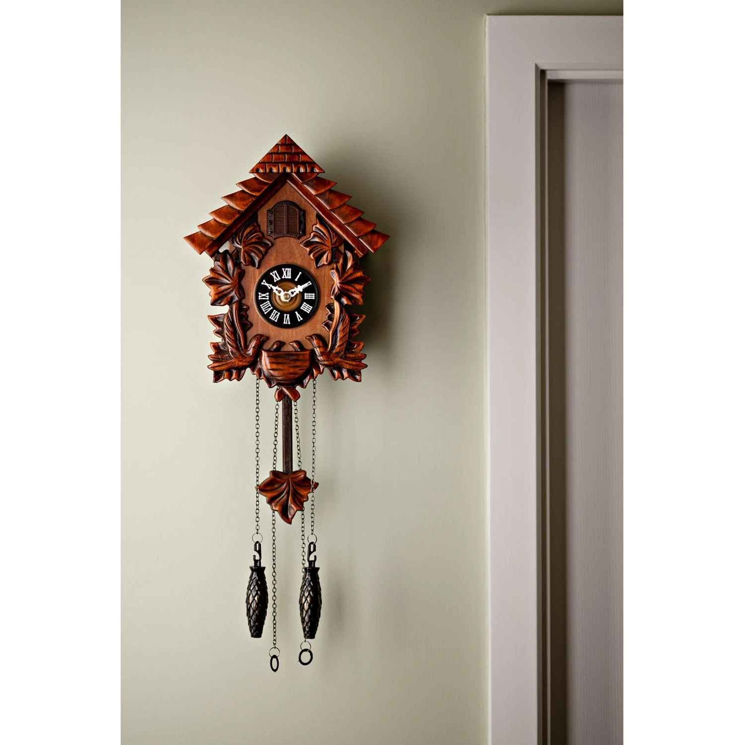 The intricate craftsmanship and decorative nature of this small, pitched roof cuckoo clock makes it a beautiful focal point for around the home. The mahogany clock is hand-carved and includes a swinging wooden leaf pendulum with decorative chain weights.