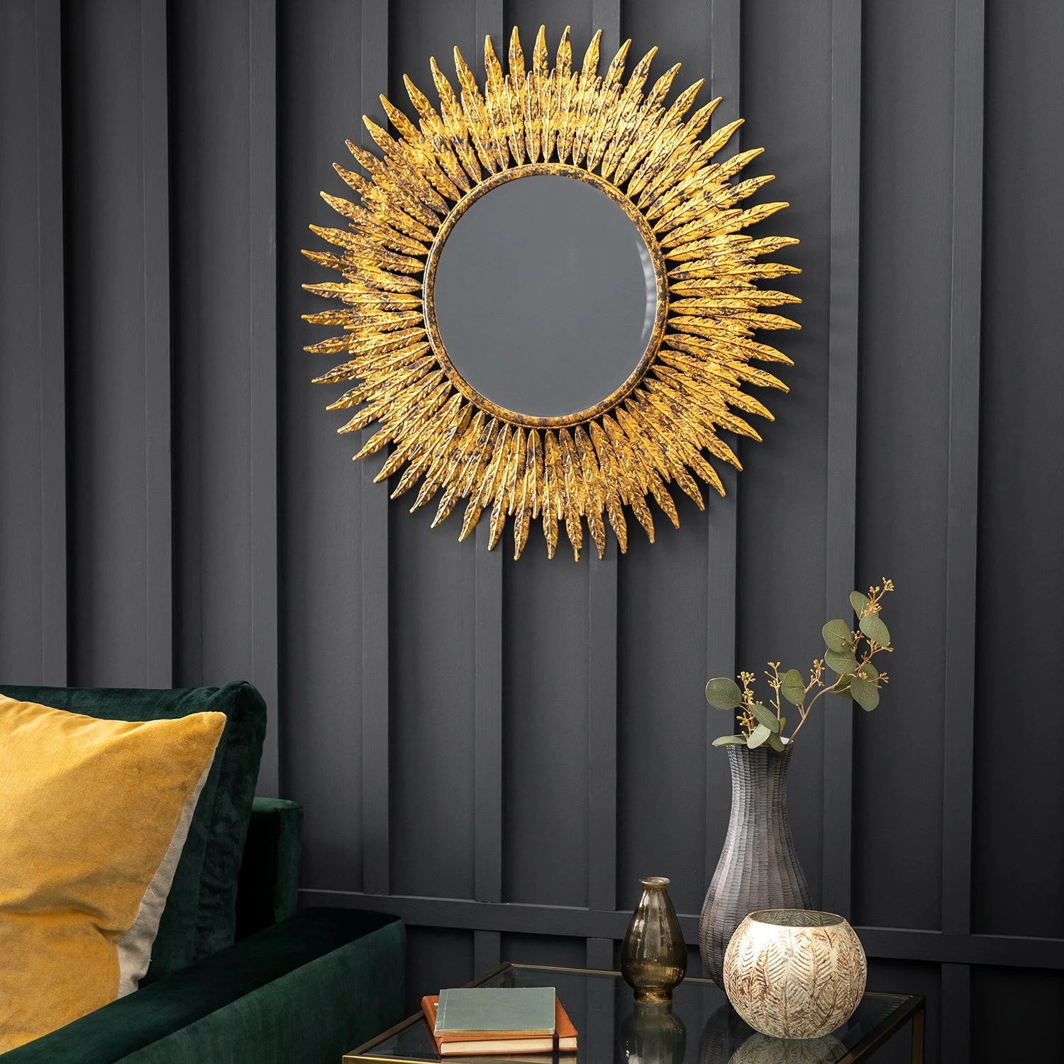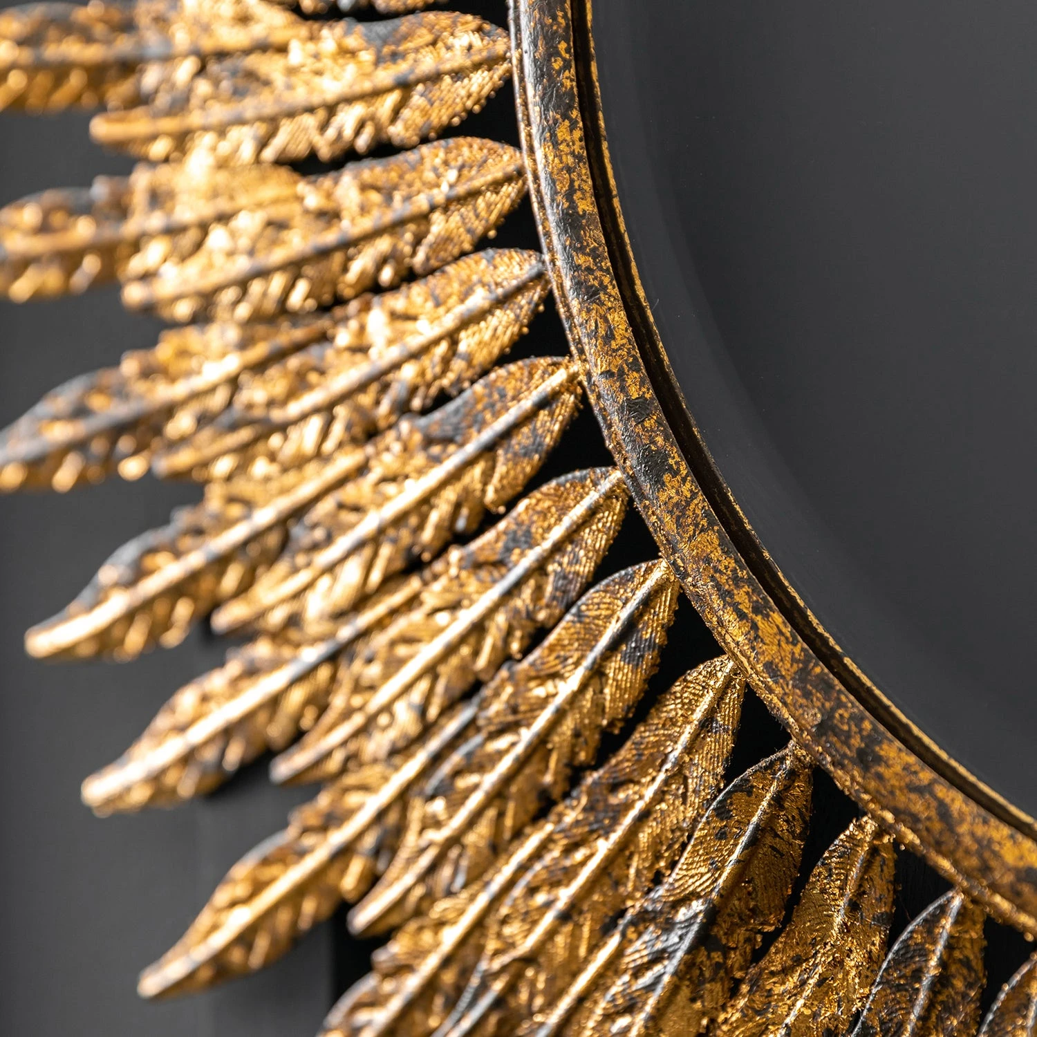 Introducing the Quill Gold Mirror: A contemporary masterpiece featuring a circular feather design and intricate detailing.