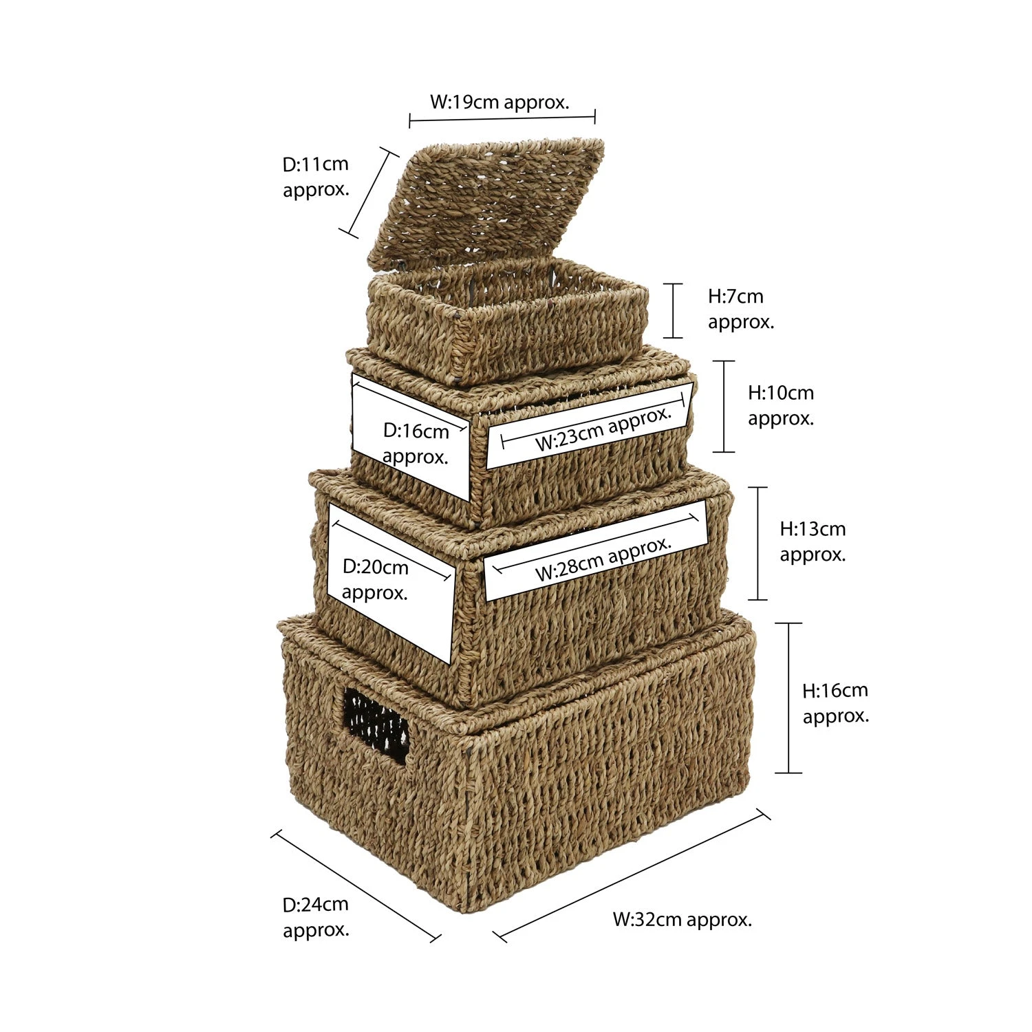 - Extra Large – H:16 x W:32 x D:24cm approx. Capacity:12l approx. Large – H:13 x W:28 x D:20cm approx. Capacity:7l approx. Medium – H:10 x W:23 x D:16cm approx. Capacity:3.5l approx. Small – H:7 x W:19 x D:11cm approx. Capacity:1.2l approx.
