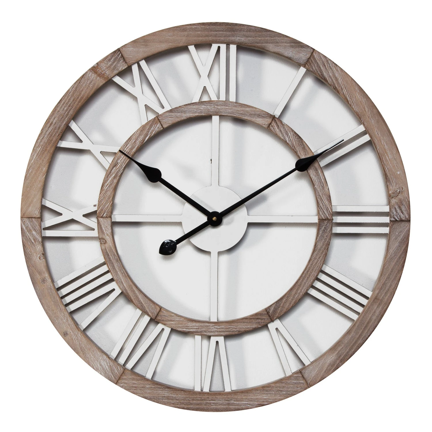 At 60cm in diameter, this time piece would be ideal for a large kitchen or living room. The Roman numeral dial is made from a whitewashed cut out MDF and features black spade hands.