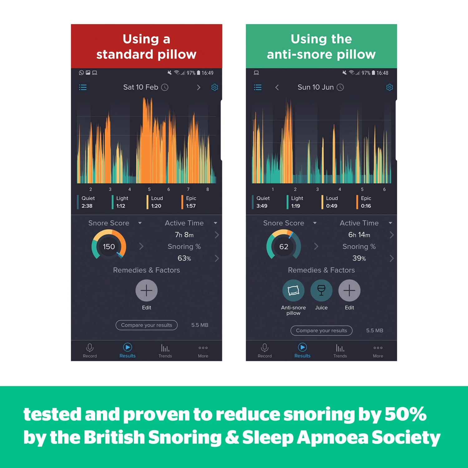 - TRIED AND TESTED: Tested by the British Snoring & Sleep Apnoea Association who found the pillow reduced snoring frequency and volume by approximately 50%.