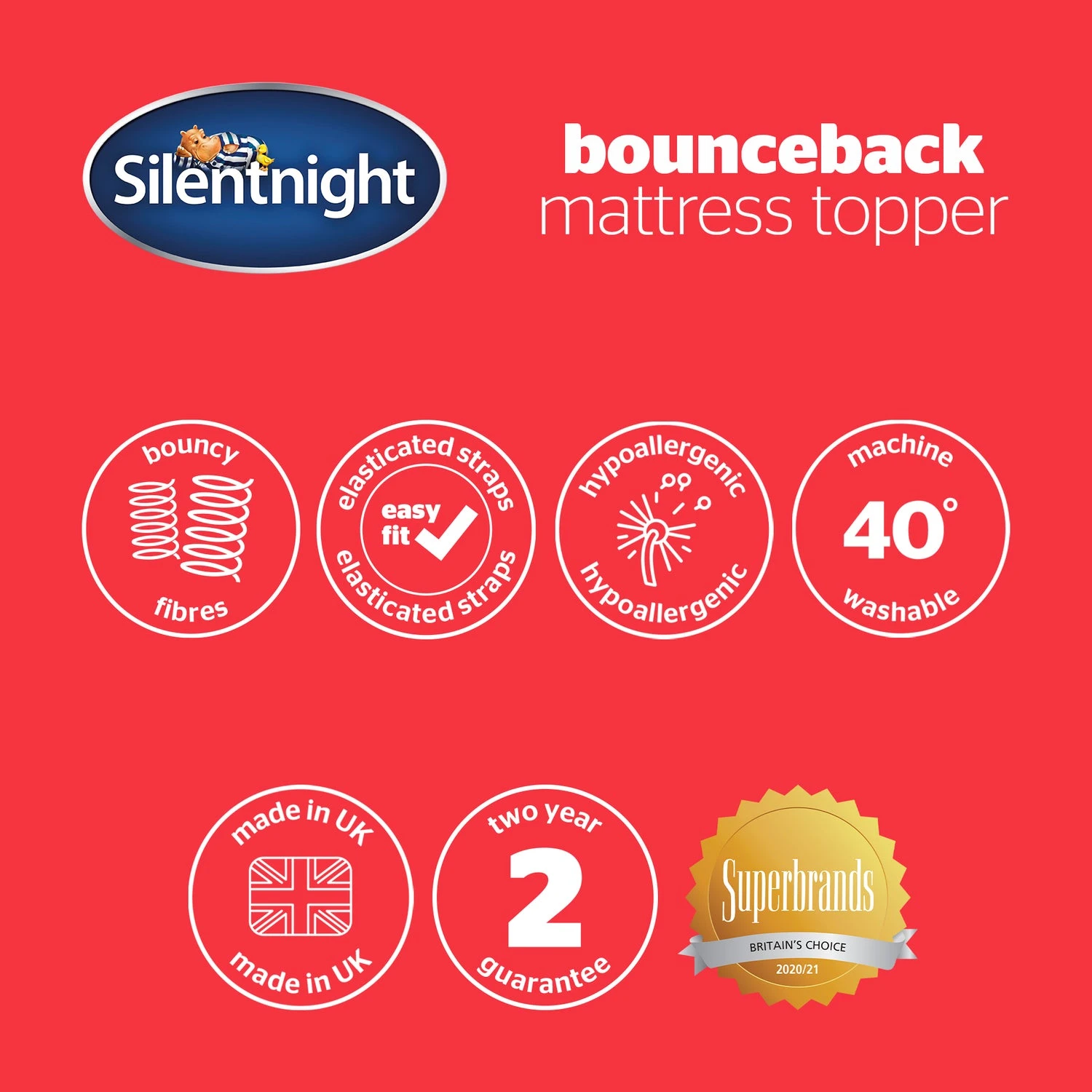 Our springy fibres naturally rebound to prevent the topper from feeling flat. The Silentnight Bounceback Mattress Topper features elasticated straps for a secure fit to keep the topper in place on your mattress.