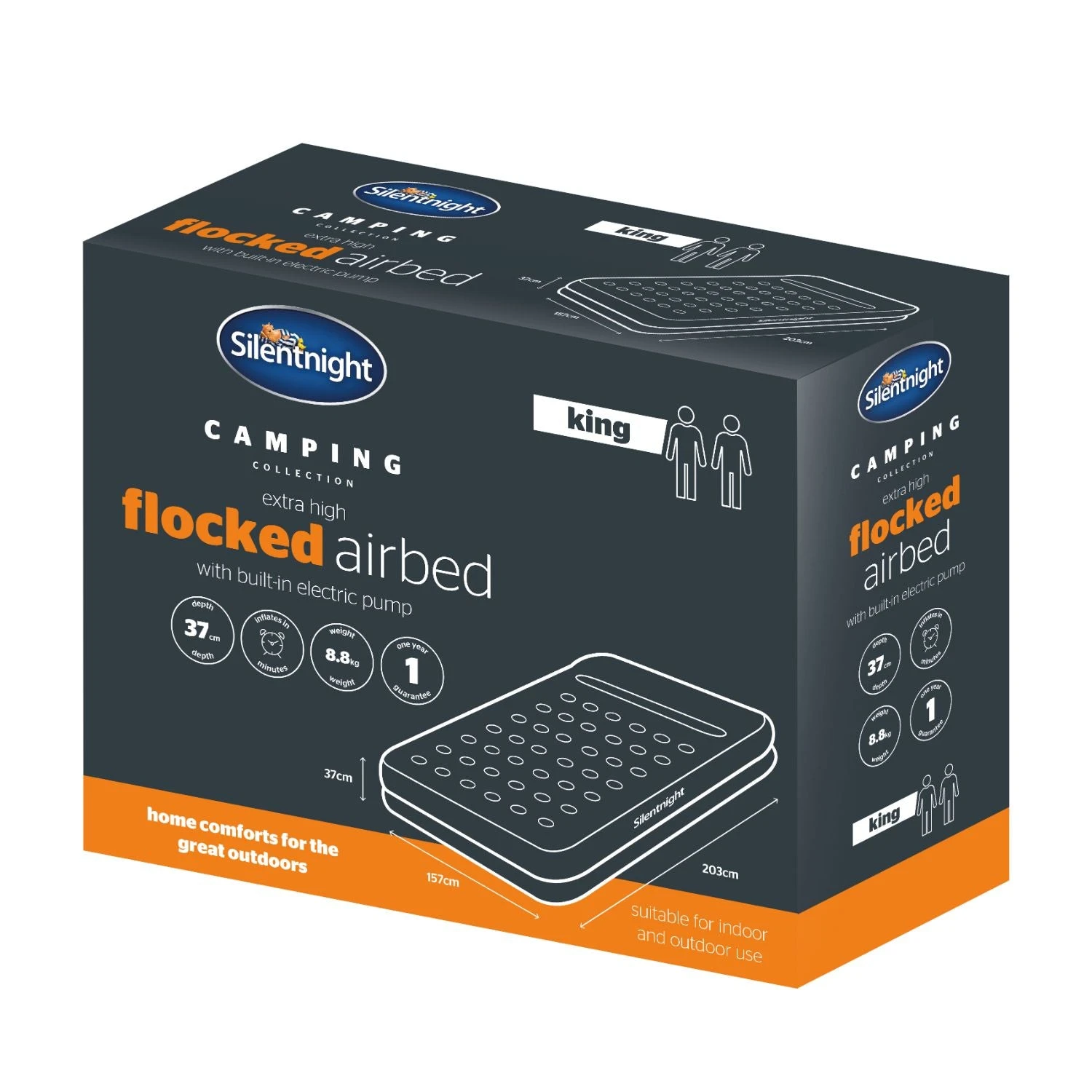 Enjoy the comfort of home in the great outdoors from Silentnight, the UK’s most trusted sleep brand. The Silentnight Extra High Flocked Airbed with Built-in Electric Pump is from the UK’s most trusted bed brand so you can bring the comfort of home to the great outdoors.