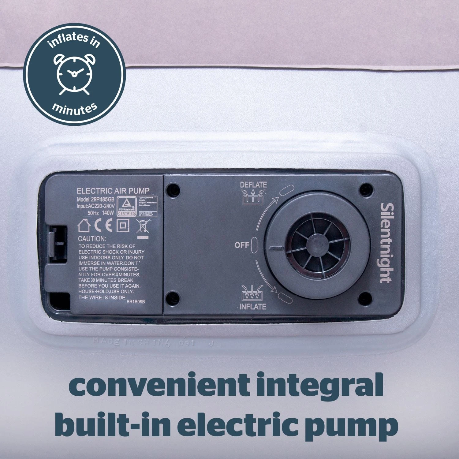 - BUILT-IN ELECTRIC PUMP: Fast inflation in minutes with the convenient integral built-in electric pump. Once inflated ensure dial is securely in the ‘off’ position to prevent air from escaping.