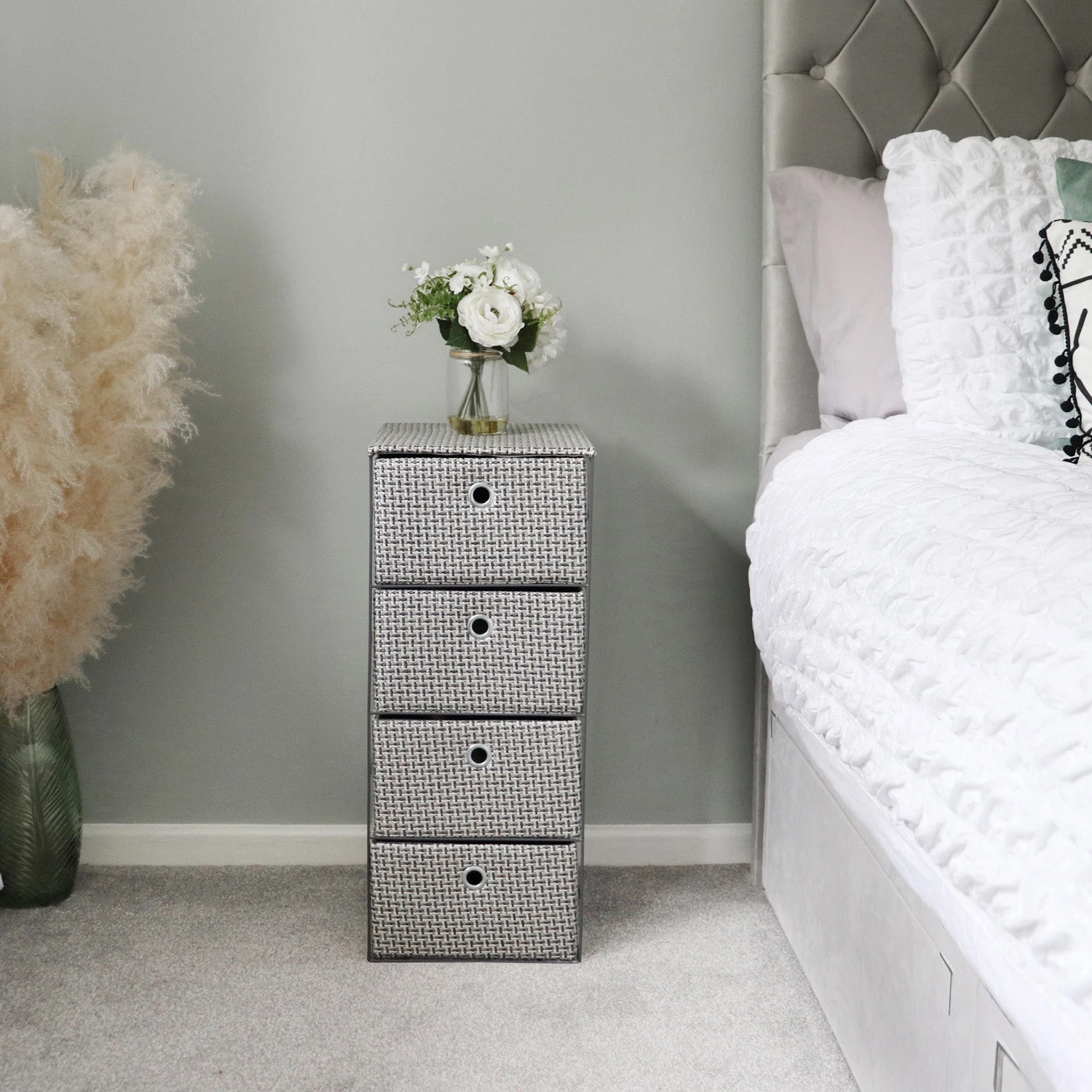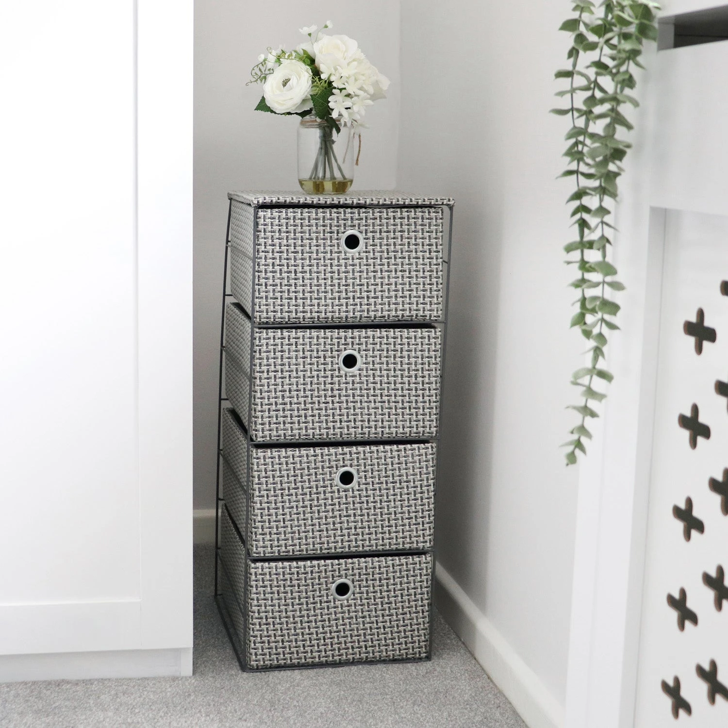 - Durable 4 drawer wide fabric storage tower.